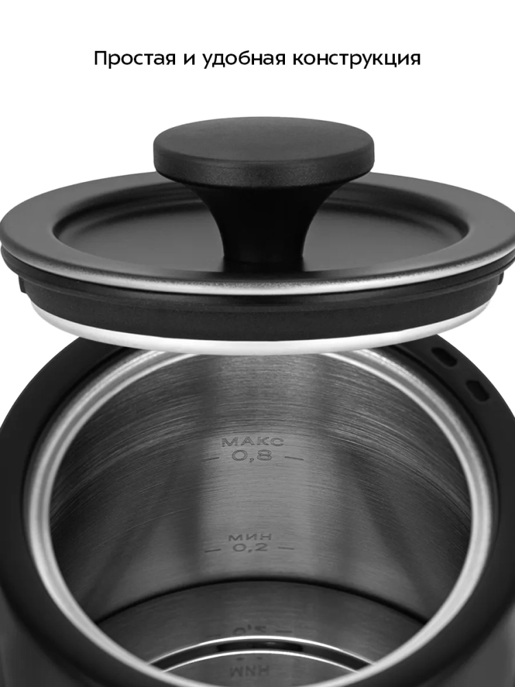 Корпус чайника выполнен из нержавеющей стали. Крышка выполнена из сочетания пластика и нержавеющей стали, а подставка — из пластмассы. Крышка чайника съемная. В ней предусмотрены отверстия для выхода пара. Максимальная и минимальная отметки находятся внутри чайника. Ручка чайника пластиковая, не нагревается и удобно лежит в руке. Переключатель расположен под ручкой. Внутренняя поверхность чайника полностью состоит из металла, благодаря чему вода не соприкасается с пластиком.