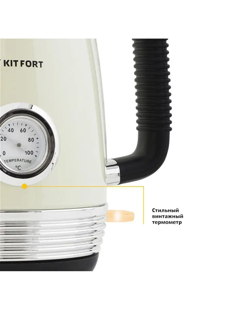 На корпусе чайника установлен термометр, который показывает температуру воды в чайнике. Это удобно, если вы готовите напитки, для которых требуются определенная температура воды, например, зеленый чай, белый чай, кофе и т. д. Для корректной работы термометра наполняйте чайник водой выше минимального уровня.
