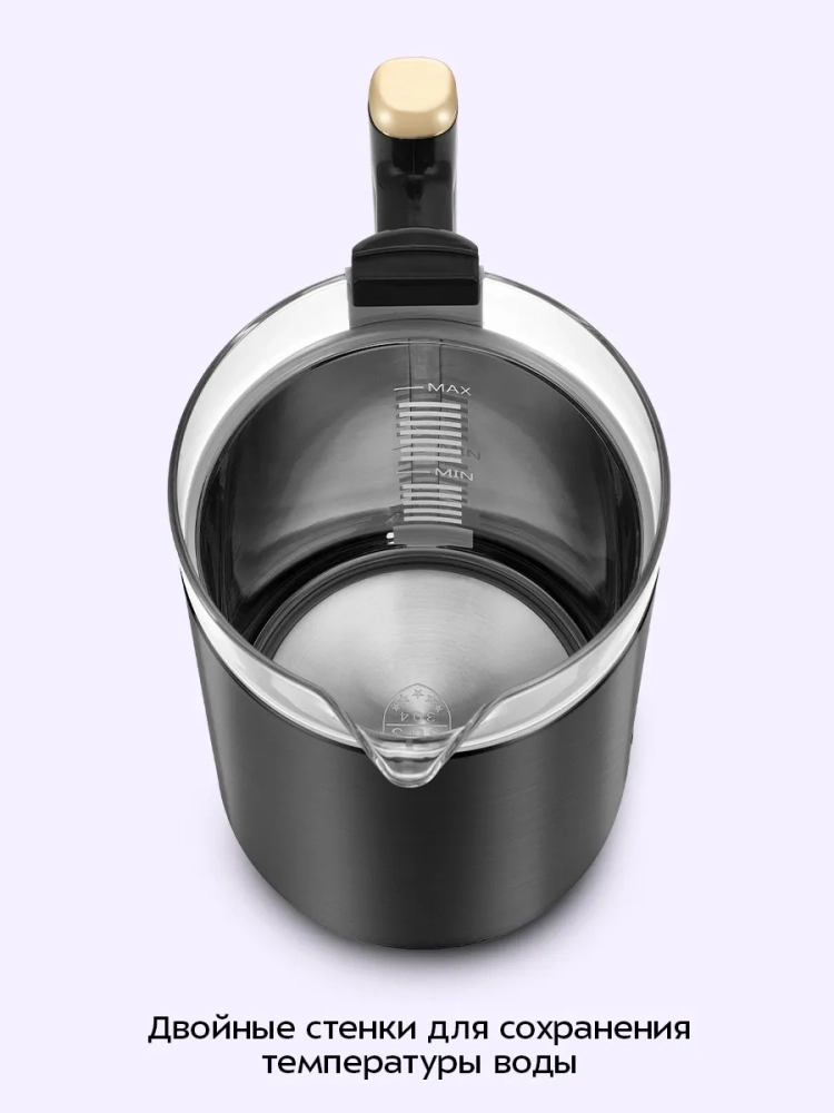 У чайника двойные стенки, благодаря чему вода будет дольше оставаться горячей. Также двойные стенки защищают от ожога, так как не сильно нагреваются. Внешняя часть чайника выполнена из нержавеющей стали. Внутренняя поверхность чайника состоит из стекла и нержавеющей стали. Крышка выполнена внутри из нержавеющей стали, а снаружи — из пластика. Подставка чайника пластиковая. Минимальная и максимальная отметки уровня воды нанесены на внутреннюю часть чайника. Ручка чайника пластиковая, не нагревается и удобно лежит в руке.