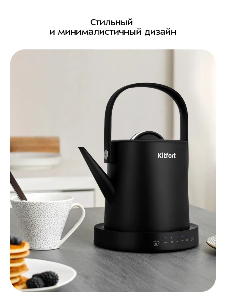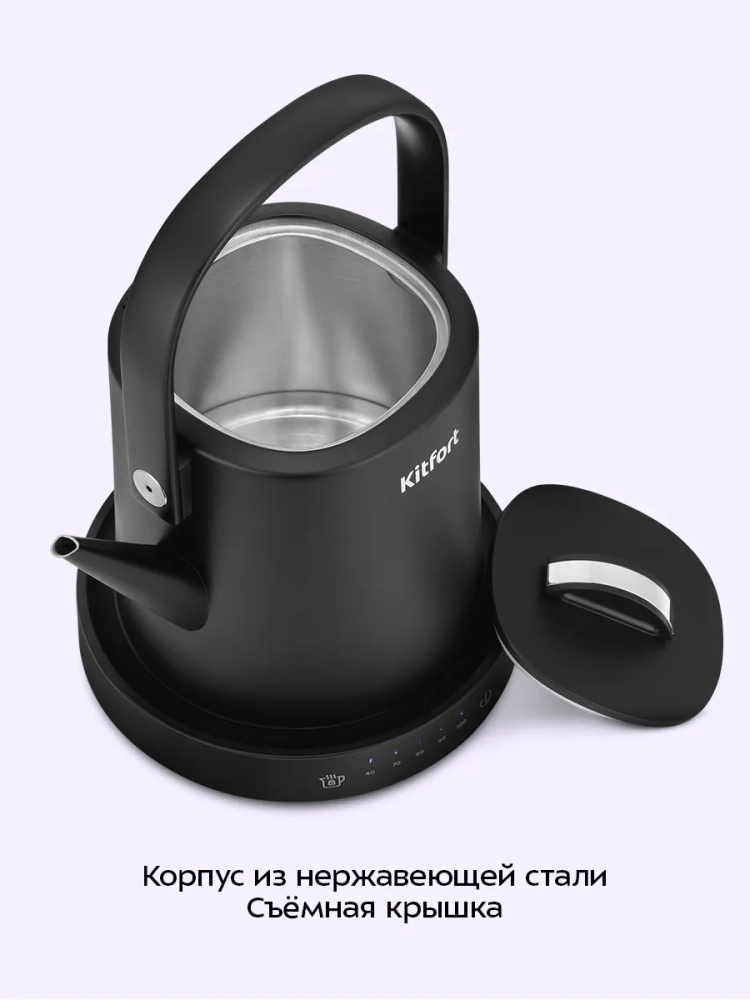 Электрический чайник Kitfort КТ-6754 может не только вскипятить воду, но и нагреть ее до температур: 40, 70, 80 и 90 °С, что очень удобно при заваривании различных сортов чая. Температура 40 °С подходит для приготовления детского питания. Чайник также оснащен функцией поддержания температуры. Температура воды контролируется встроенным в дно чайника термодатчиком.
