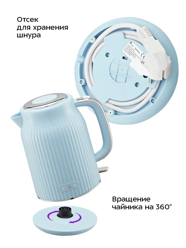 Подставка с центральным контактом дает возможность располагать на ней чайник в любом положении, обеспечивая вращение на 360°. Снизу имеется отсек для хранения шнура, в который можно смотать излишки шнура электропитания, чтобы он не мешал на столе.