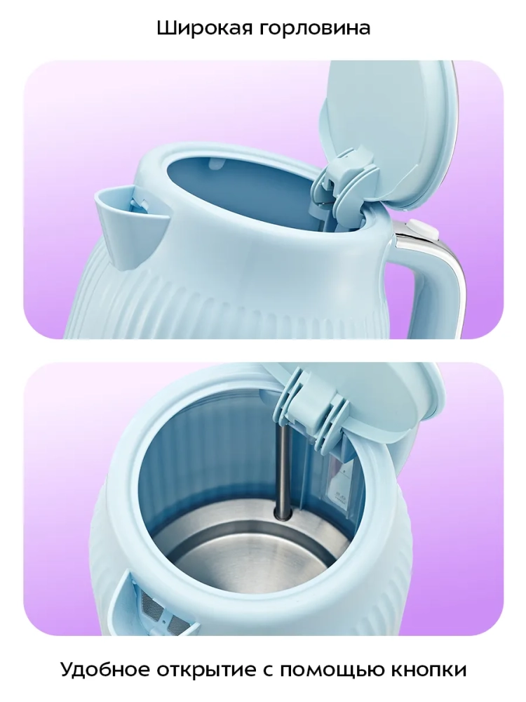 Чайник автоматически отключается при закипании, имеет защиту от перегрева и от включения без воды. В носике чайника расположен фильтр от накипи.