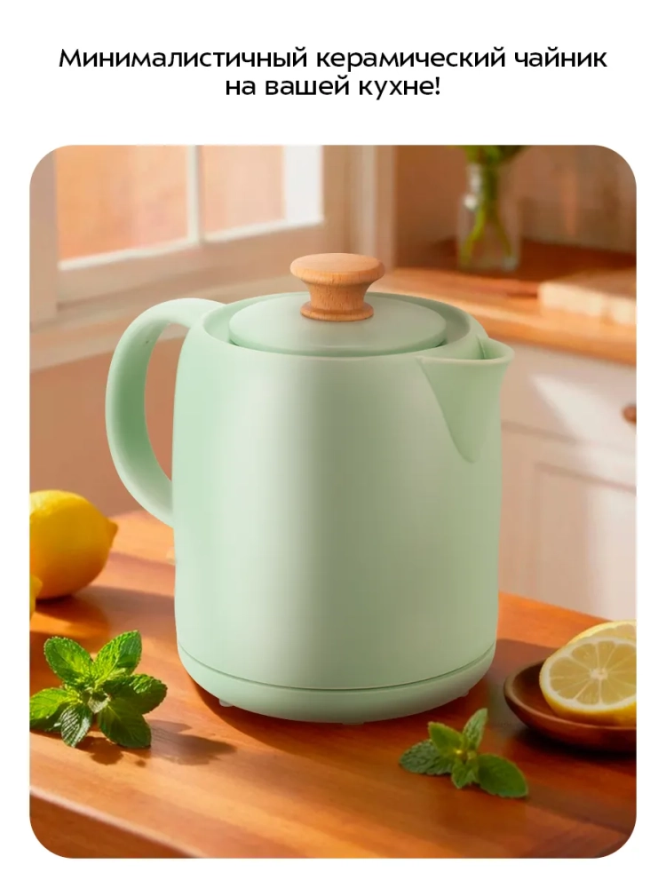 Корпус чайника выполнен из термостойкой керамики, покрыт глазурью. Керамика является экологически чистым материалом и не будет выделять токсичных веществ в отличие, например, от пластика. Кнопка включения/выключения расположена на корпусе снизу, на противоположной стороне от носика чайника. В кнопку включения/выключения встроен индикатор нагрева.