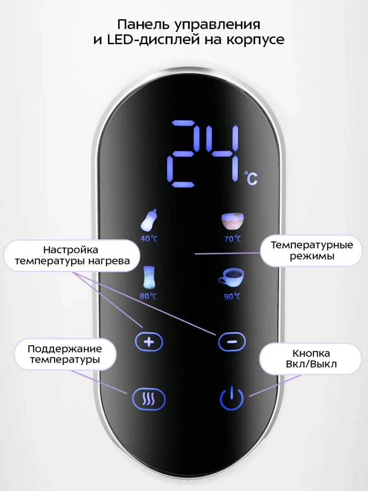 Электрический чайник поддерживает использование нескольких температурных режимов, что обеспечивается благодаря высокоточному сенсорному управлению. Выбирайте режим с нужной температурой для оптимального заваривания различных типов чая. Прочная подставка из нержавеющей стали обеспечивает стабильность электрочайника во время работы, а эргономичный дизайн позволяет легко перемещать и ставить чайник на подставку.