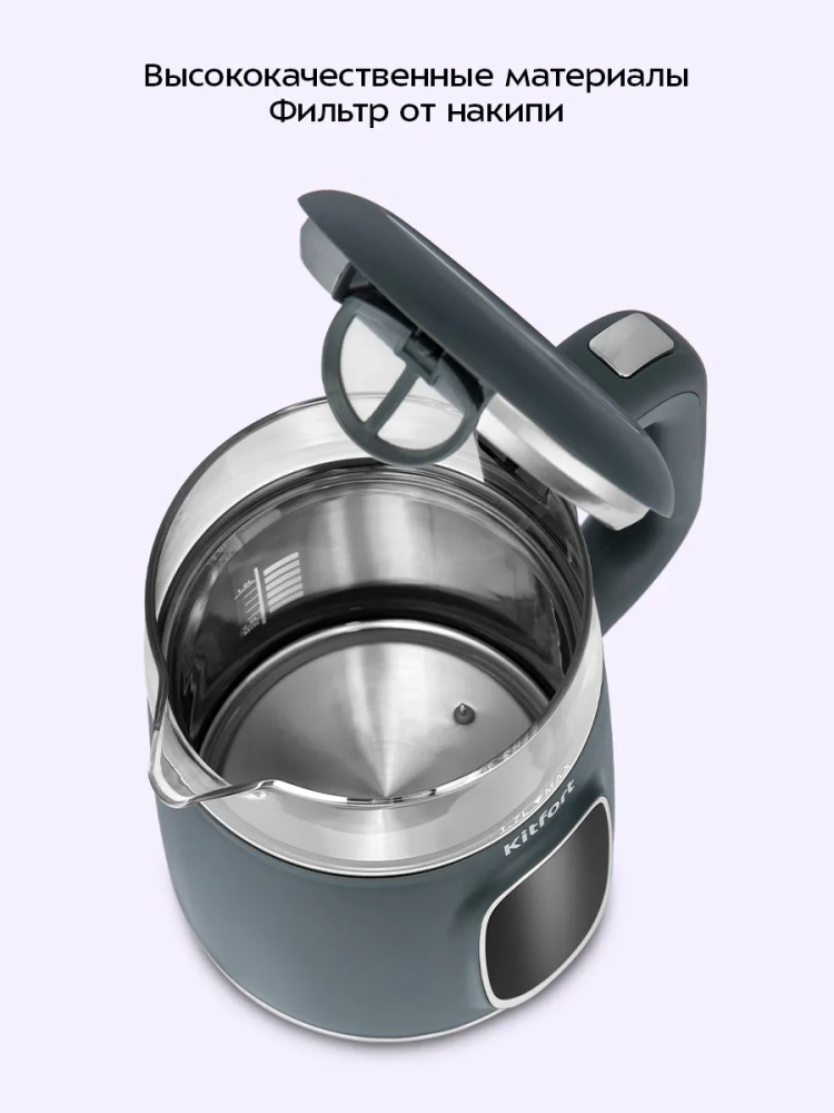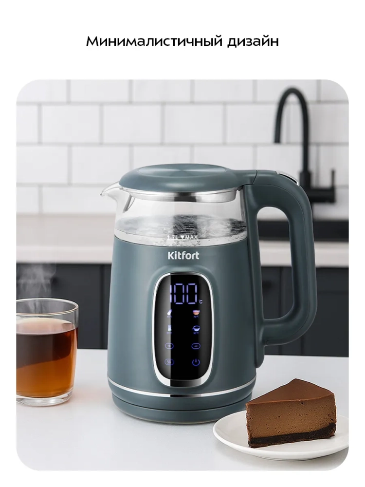 Электрический чайник Kitfort КТ-8755 предназначен для кипячения и нагревания воды дома, в офисе, на даче. Вы можете установить температуру 40–100 °С с шагом 5 °С, а также быстро установить температуру 40, 70, 80 или 90 °С с помощью кнопок температурных режимов. После нагрева прибор будет поддерживать заданную температуру в течение 2 часов. Температура воды контролируется встроенным в дно чайника термодатчиком.