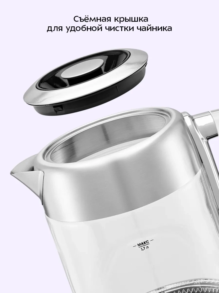 Полный чайник закипает примерно за 6 минут. Чайник автоматически отключается при закипании, имеет защиту от перегрева и от включения без воды. В носике чайника расположен съемный фильтр от накипи.