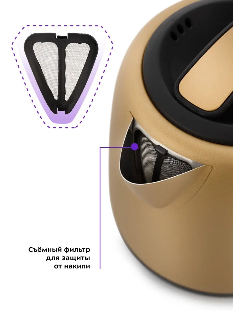 В носике чайника расположен съемный фильтр от накипи, выполненный из нержавеющей стали, который задерживает частички накипи и предотвращает попадание их в чашку.