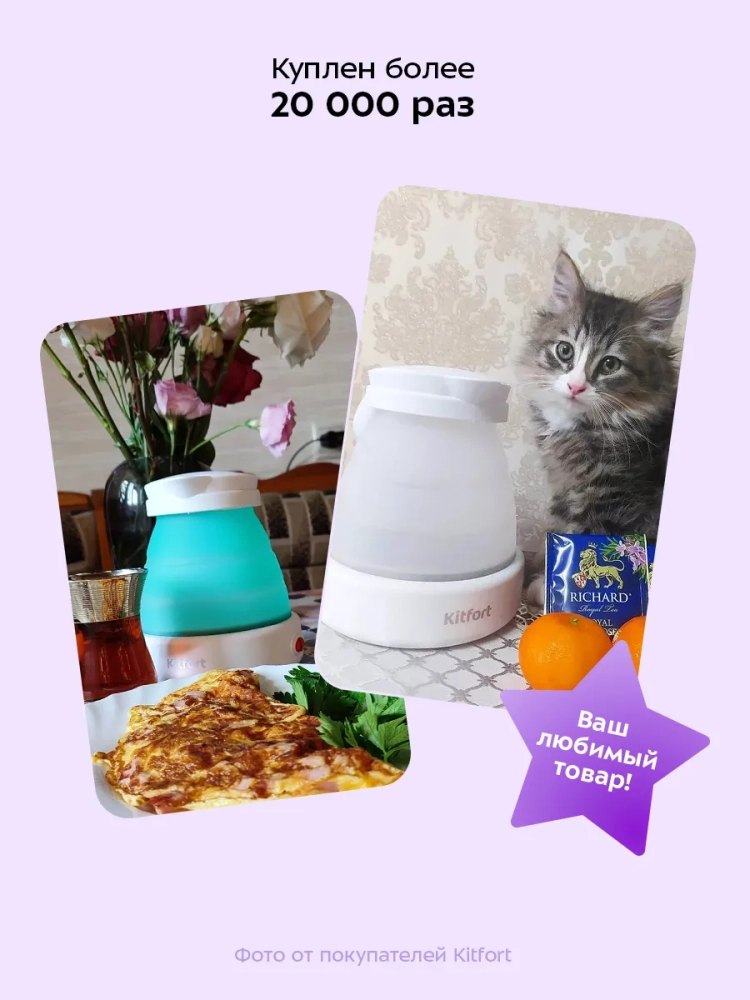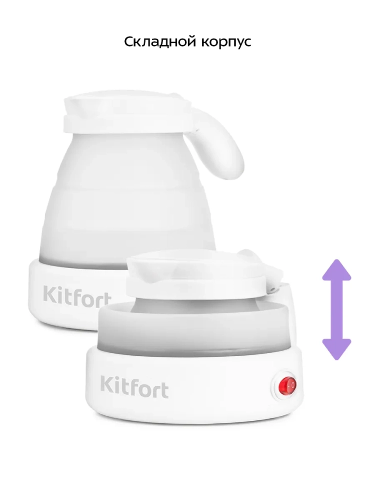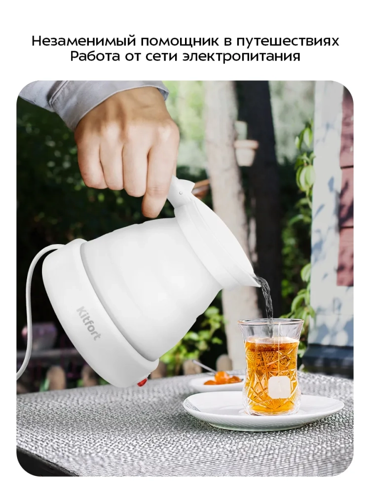 Складной дорожный чайник Kitfort КТ-667 станет незаменимым помощником в путешествиях, деловых поездках и в любых других сложных бытовых условиях. Его корпус эластичный и складывается, так что его можно компактно уложить в багажный чемодан или сумку и везде возить с собой.