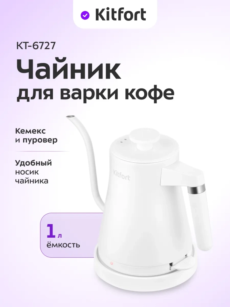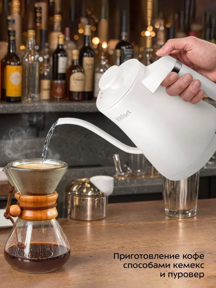 Электрический чайник Kitfort KT-6727 предназначен для кипячения воды и приготовления кофе способами кемекс и пуровер.