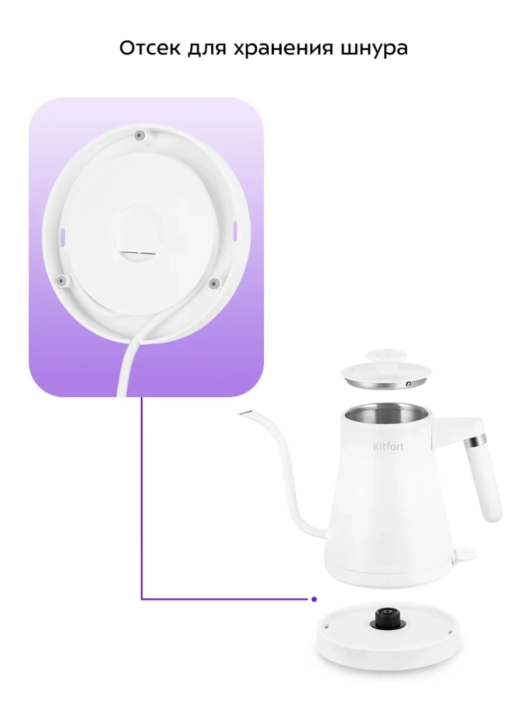 Подставка с центральным контактом дает возможность располагать на ней чайник в любом положении, обеспечивая вращение на 360°. Снизу имеется отсек для хранения шнура, в который можно смотать излишки шнура электропитания, чтобы он не мешал на столе.
