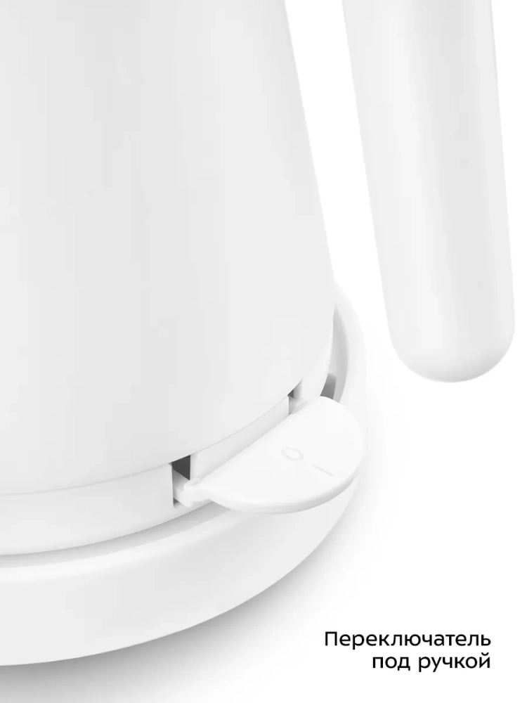 Переключатель расположен под ручкой. При включении чайника загорается индикатор.