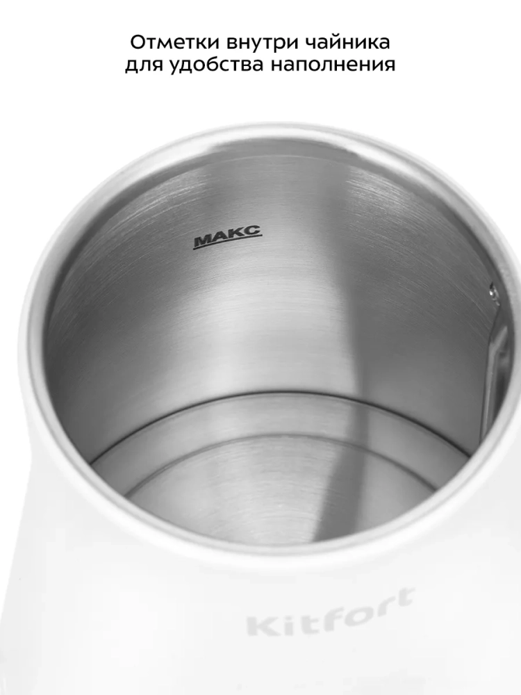 Чайник автоматически отключается при закипании, имеет защиту от перегрева и от включения без воды. Мощность чайника позволяет использовать его в домах со слабой проводкой.