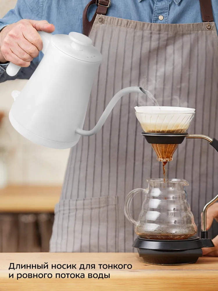 Длинный изогнутый носик чайника формирует тонкий и ровный поток воды, что является обязательным условием для приготовления кофе в кемексе или пуровере. Благодаря тонкому носику вы сможете постепенно и аккуратно добавлять воду в кофе, добиваясь равномерной экстракции.