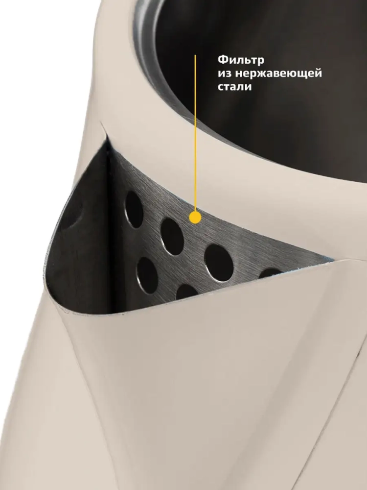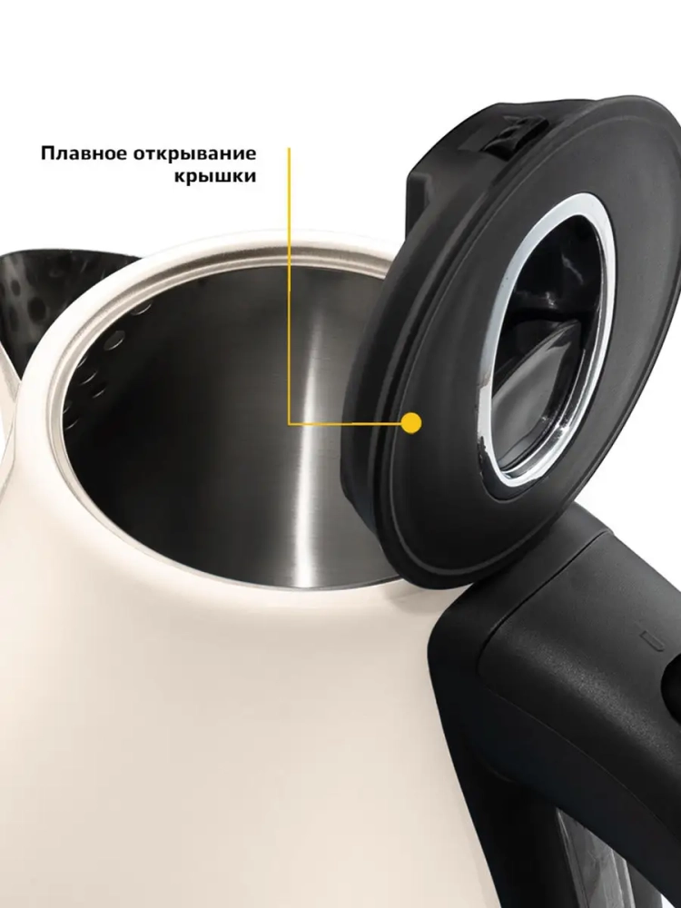 Корпус чайника выполнен из нержавеющей стали, а крышка и подставка — из пластика. Мерная шкала нанесена на корпус под рукой. Большое горлышко чайника облегчает доступ внутрь при мытье и во время удаления накипи. Ручка чайника пластиковая, не нагревается и удобно лежит в руке.