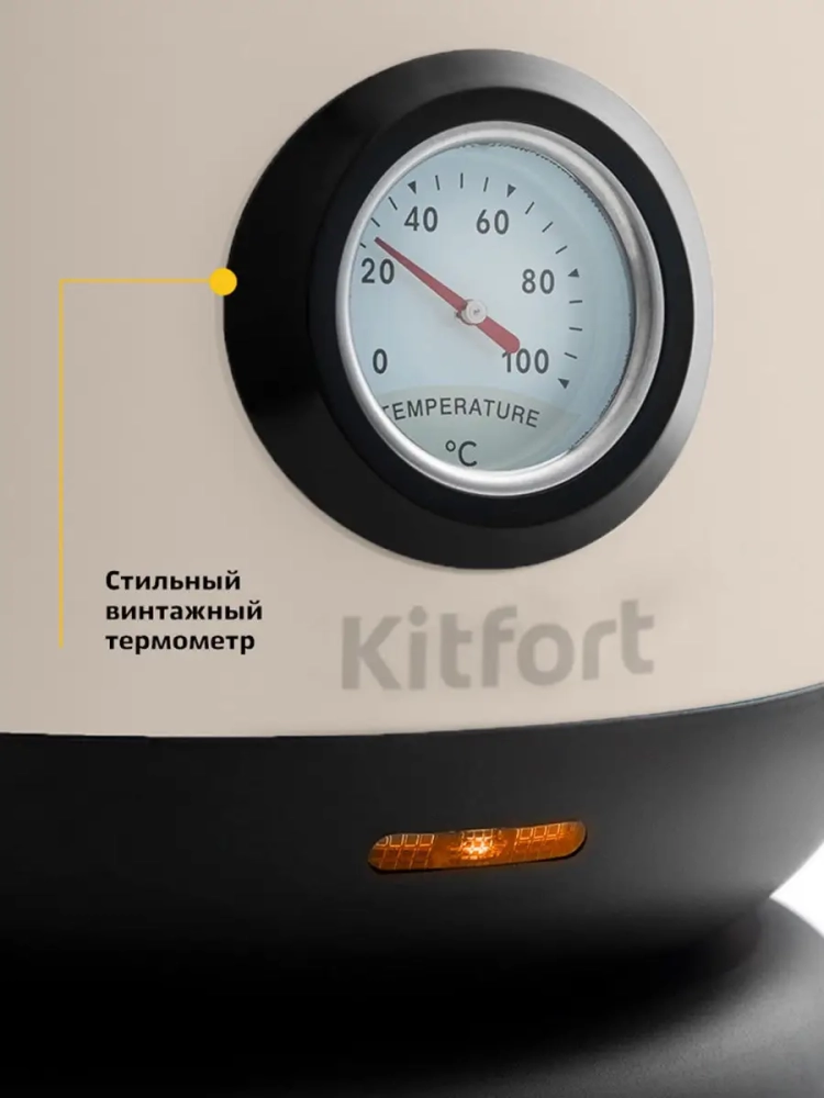 Кнопка открывания крышки расположена сверху на крышке, а кнопка включения — на ручке. При включении чайника загорается индикатор работы. Спереди на корпусе расположен аналоговый термометр, отображающий температуру воды в чайнике.