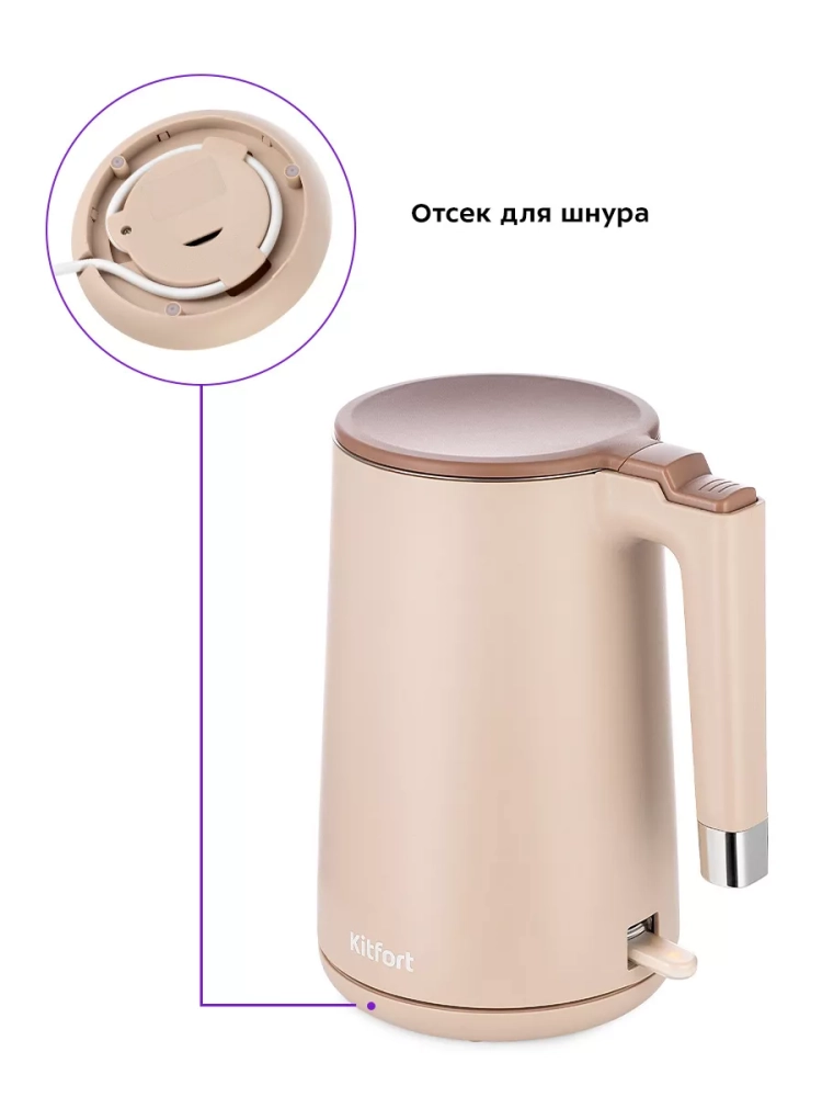 Подставка с центральным контактом дает возможность располагать на ней чайник в любом положении, обеспечивая вращение на 360°. Снизу имеется отсек для хранения шнура, в который можно смотать излишки шнура электропитания, чтобы он не мешал на столе.