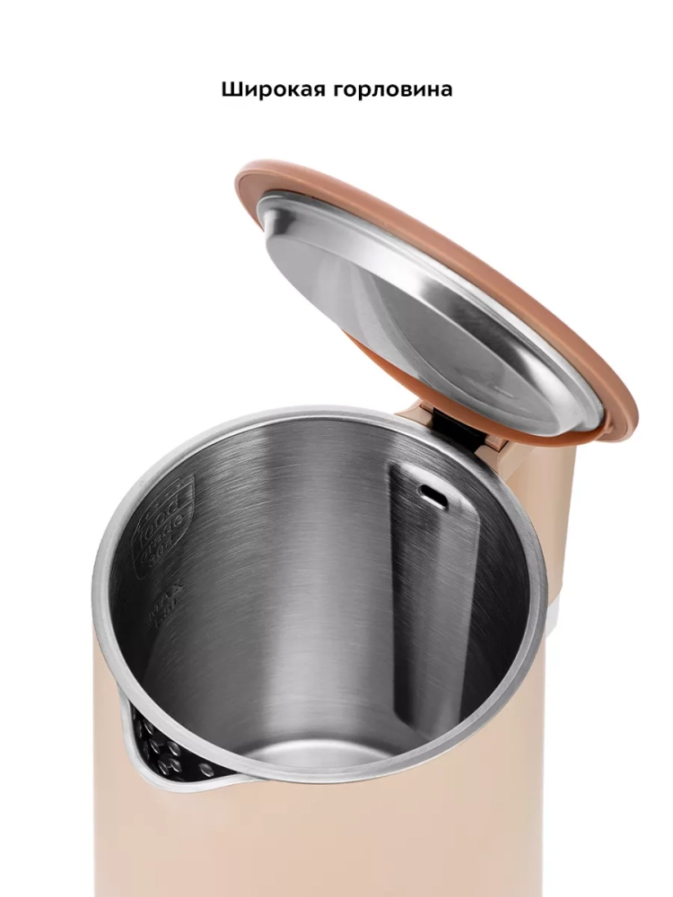 У чайника двойные стенки, благодаря чему вода будет дольше оставаться горячей. Также двойные стенки защищают от ожога, так как не сильно нагреваются. Внешняя часть чайника выполнена из пластмассы. Внутренняя поверхность чайника полностью состоит из нержавеющей стали, благодаря чему вода не соприкасается с пластиком. Крышка также выполнена внутри из нержавеющей стали, а снаружи — из пластмассы. Подставка чайника пластиковая. Отметки «MAX» и «MIN» нанесены на внутреннюю часть чайника. Ручка чайника пластиковая, не нагревается и удобно лежит в руке. При включении чайника загорается подсветка переключателя.