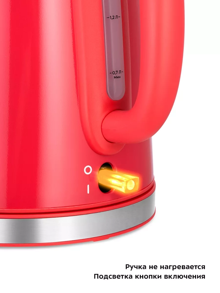 На крышке чайника располагается ручка для ее удобного открытия и закрытия. Для закрытия крышки просто установите крышку на место и надавите на нее до упора. Кнопка включения/выключения находится под ручкой, при включении чайника на ней загорается подсветка, которая является индикатором работы.