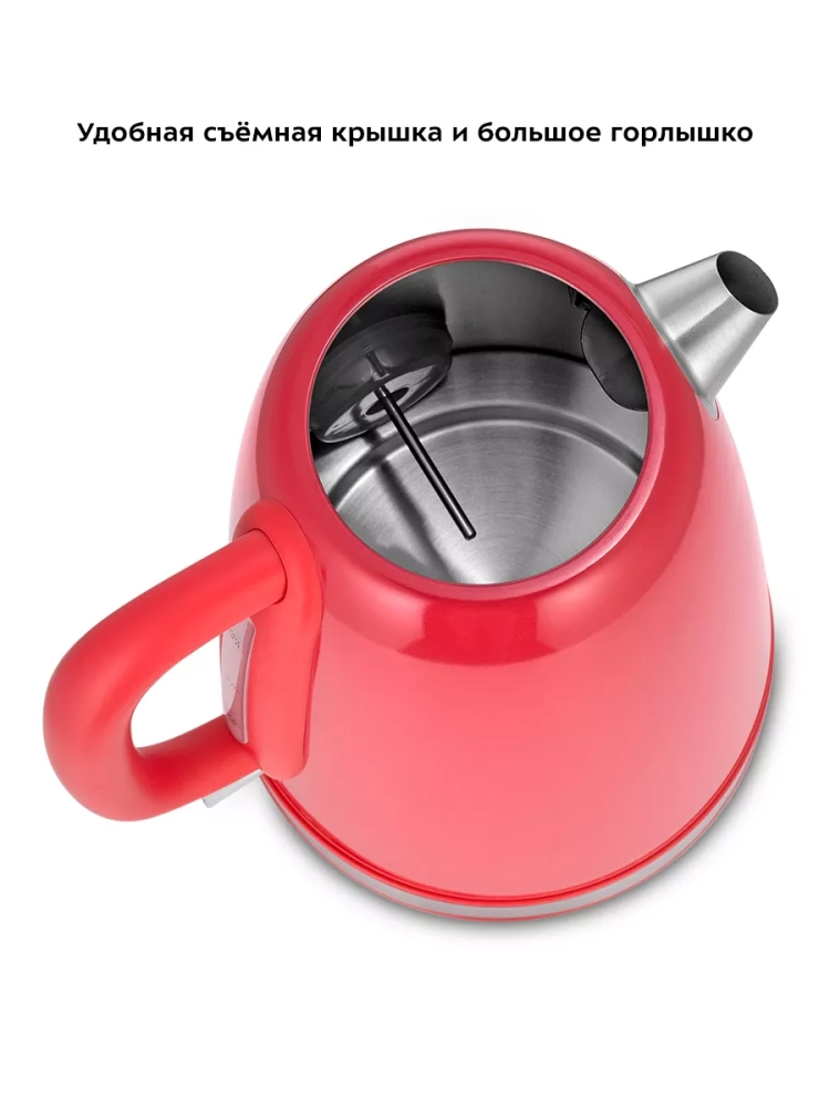 Корпус чайника из нержавеющей стали. Крышка выполнена из нержавеющей стали с сочетанием пластика, а подставка выполнена из пластика. Мерная шкала находится под ручкой. Ручка чайника пластиковая, не нагревается и удобно лежит в руке. Внутренняя поверхность чайника выполнена из нержавеющей стали, благодаря чему вода не соприкасается с пластиком.