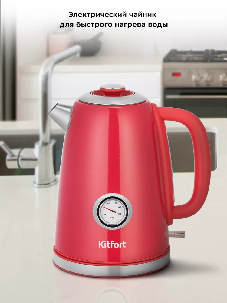 На корпусе чайника установлен термометр, который показывает температуру воды в чайнике. Это удобно, если вы готовите напитки, для которых требуется определенная температура воды, например, зеленый чай, белый чай, кофе и т. д. Принцип работы термометра термомеханический: биметаллическая пластина при изменении температуры деформируется и приводит в движение стрелку термометра. Для корректной работы термометра наполняйте чайник водой выше минимального уровня, чтобы щуп термометра полностью находился в воде.