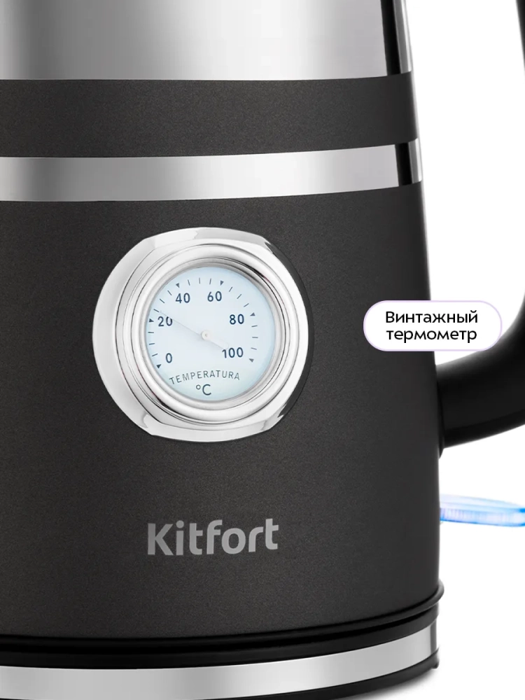 На корпусе чайника установлен термометр, который показывает температуру воды в чайнике. Это удобно, если вы готовите напитки, для которых требуются определенная температура воды, например, зеленый чай, белый чай, кофе и т. д. Для корректной работы термометра наполняйте чайник водой выше минимального уровня.