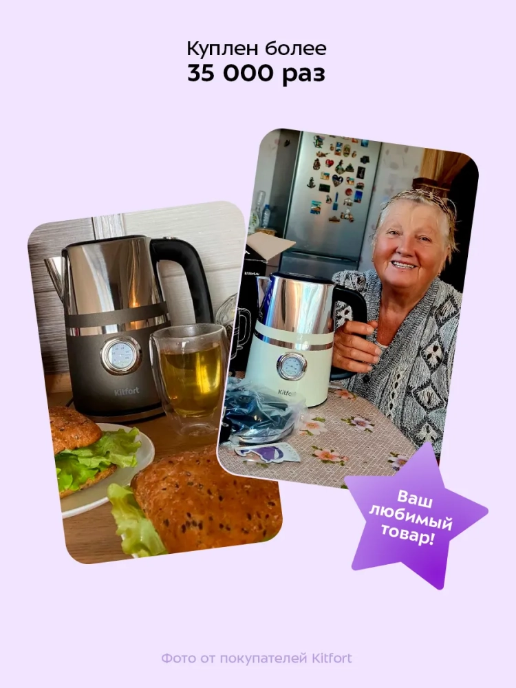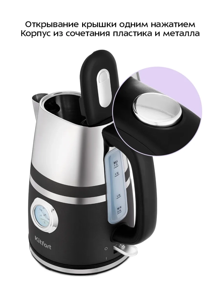 Чайник Китфорт КТ-670 автоматически отключается при закипании и при снятии с подставки, имеет защиту от перегрева и от включения без воды.