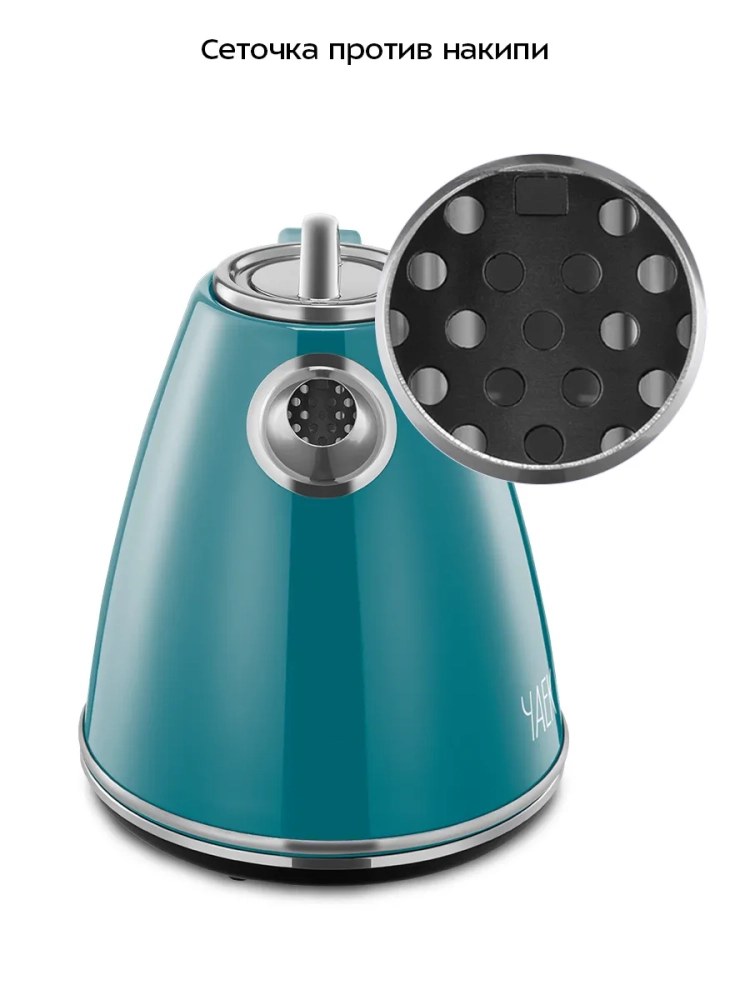 Нагревательный элемент (ТЭН) у этой модели чайника скрытый. Он находится в донной части. Сверху он закрыт специальной металлической пластиной из нержавеющей стали, благодаря которой исключается прямой контакт ТЭНа с водой. Такая конструкция препятствует образованию накипи, облегчает уход и значительно снижает шум при нагревании воды.