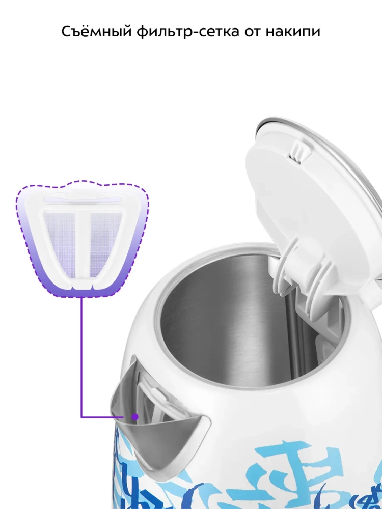 Полный чайник закипает примерно за 6 минут. Чайник автоматически отключается при закипании и снятии с подставки, имеет защиту от перегрева и от включения без воды. Чайник также оснащен фильтром от накипи.
