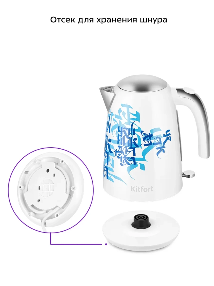 Подставка с центральным контактом дает возможность располагать на ней чайник в любом положении, обеспечивая вращение на 360°. Снизу имеется отсек для хранения шнура, в который можно смотать излишки шнура электропитания, чтобы он не мешал на столе.