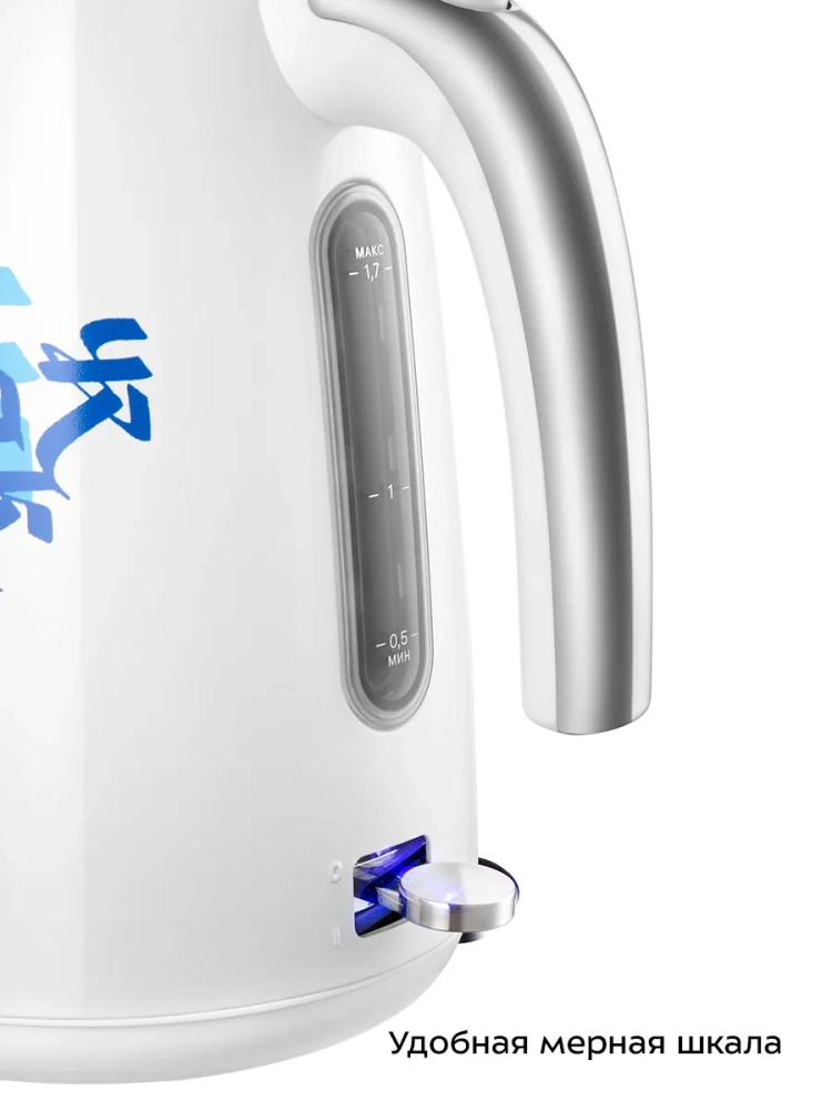 Кнопка открывания крышки расположена на ручке чайника, а переключатель — под ручкой. При включении загорается подсветка переключателя.