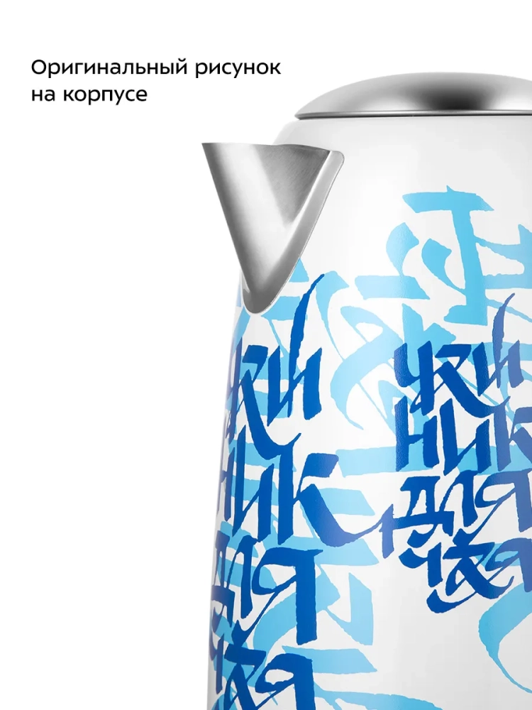 Корпус чайника выполнен из нержавеющей стали, а крышка — из нержавеющей стали и пластика. Мерная шкала находится сбоку под ручкой чайника. Ручка пластиковая, она не нагревается и удобно лежит в руке.