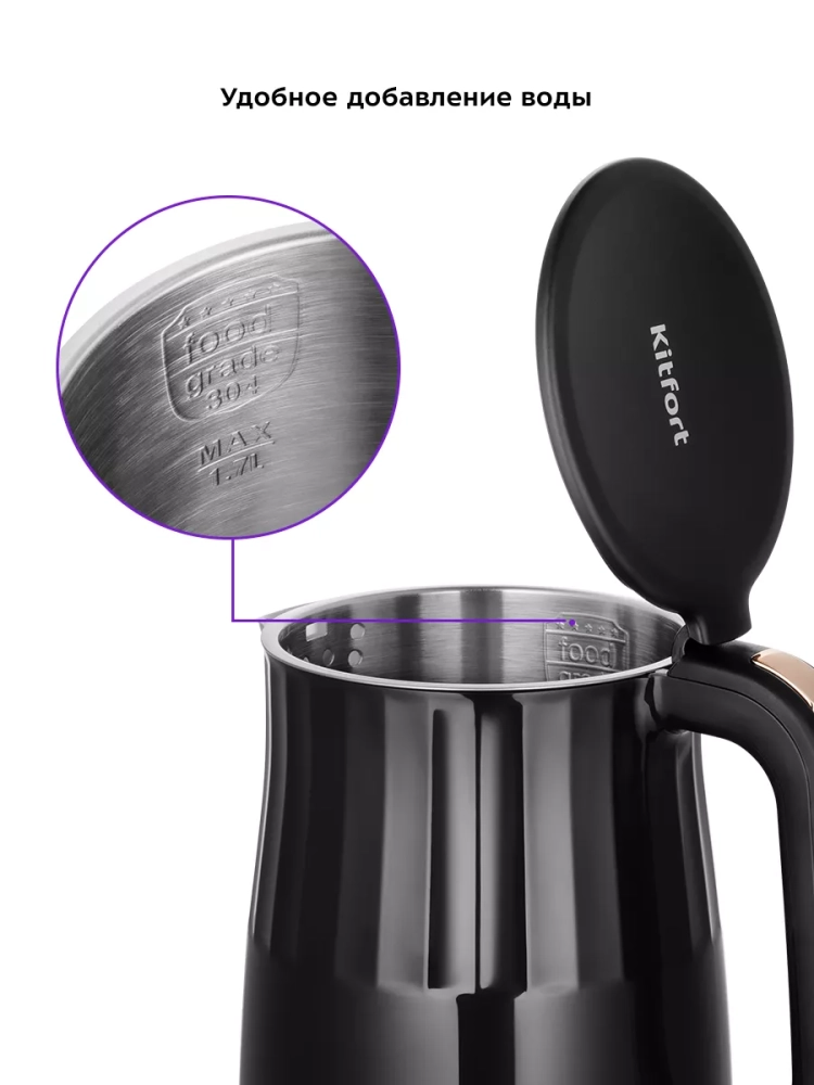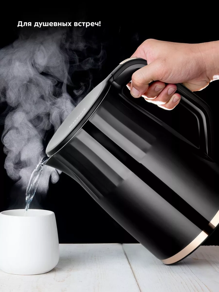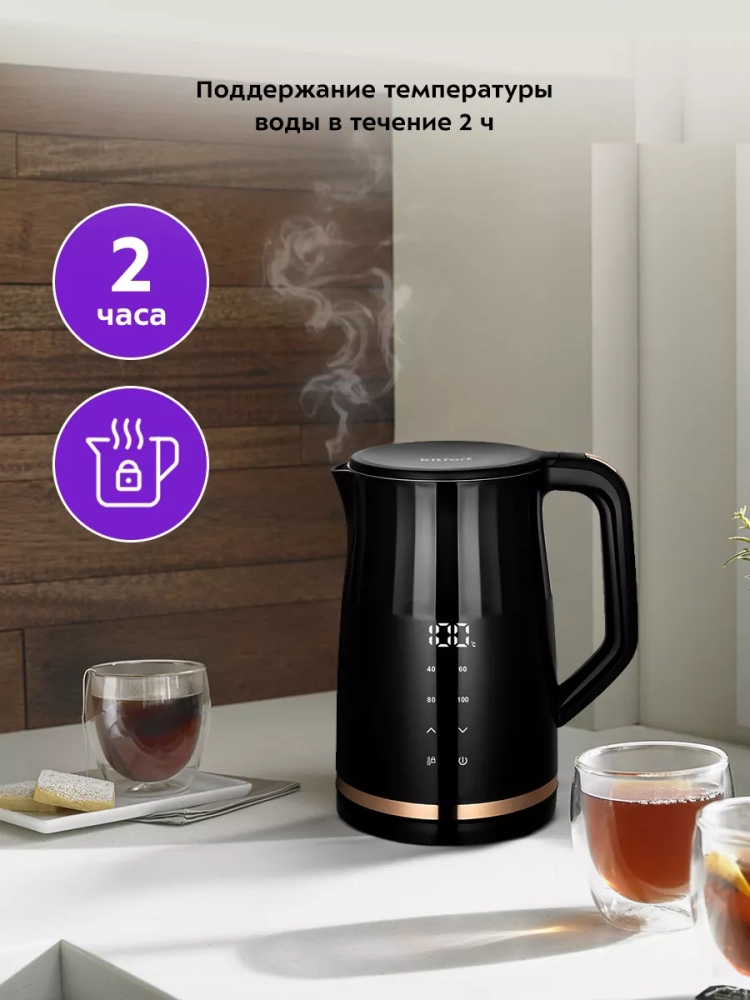 Электрический чайник с электронным терморегулятором Kitfort КТ-6610 может не только вскипятить воду, но и нагреть ее до заданной температуры. Вы можете настроить температуру нагрева в диапазоне от 40 до 95 °С с шагом 5 °С, что очень удобно при заваривании различных сортов чая. Чайник также оснащен поддержания температуры в течение 2 часов. Температура воды контролируется встроенным в дно чайника термодатчиком.