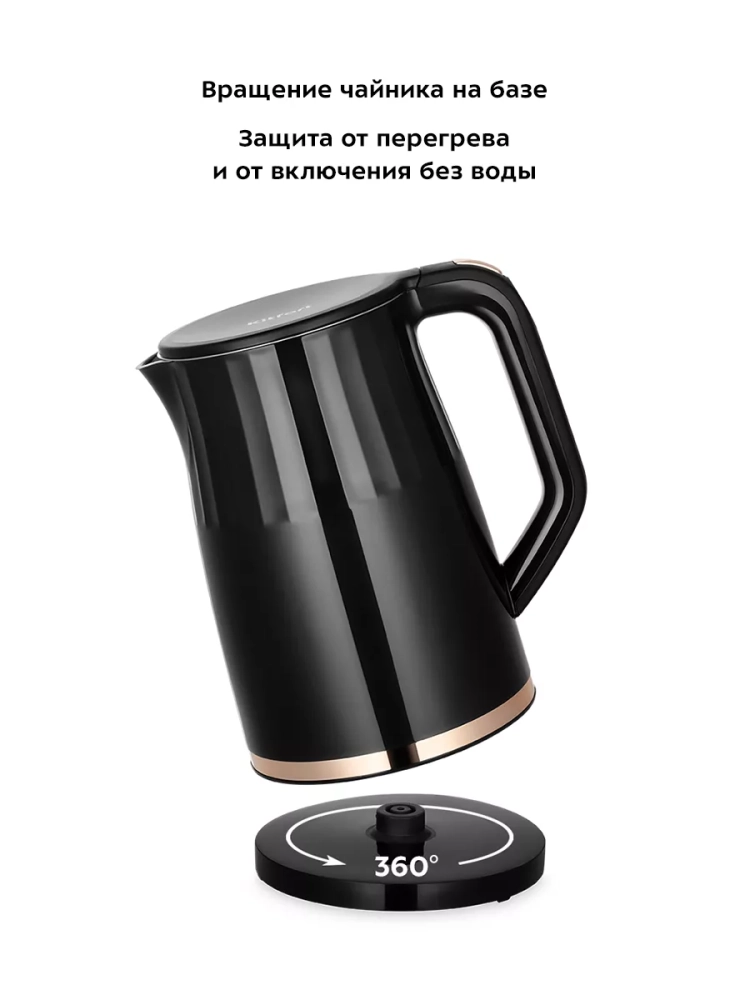 Подставка с центральным контактом дает возможность располагать на ней чайник в любом положении, обеспечивая вращение на 360°. На дне подставки имеется отсек для хранения шнура, чтобы излишки шнура не мешали на столе.