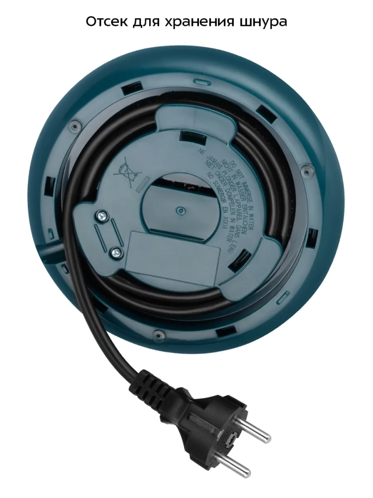 Подставка с центральным контактом дает возможность располагать на ней чайник в любом положении, обеспечивая вращение на 360°. Снизу подставки расположен отсек для хранения шнура, чтобы шнур не мешал на столе.