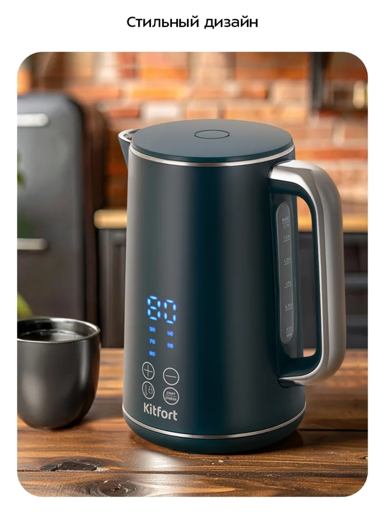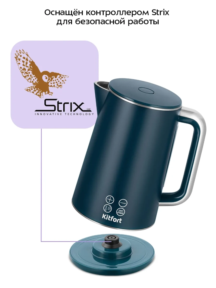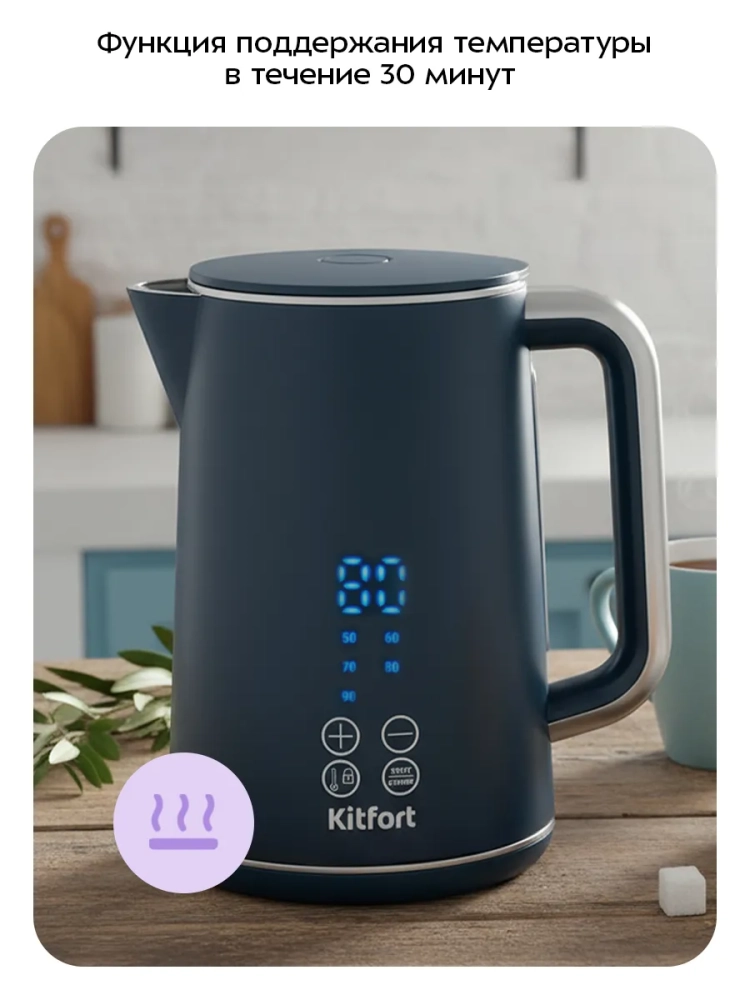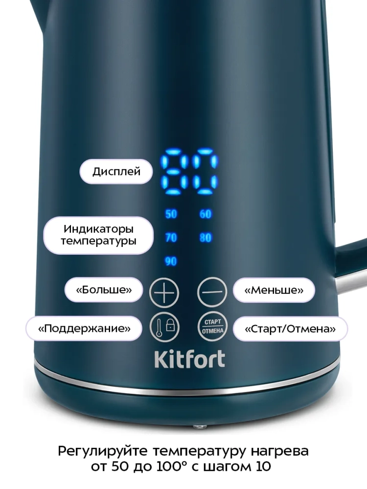Электрический чайник с электронным терморегулятором Kitfort КТ-6784 может не только вскипятить воду, но и нагреть ее до температуры в диапазоне от 50 до 90 °С с шагом 10 °С, что очень удобно при заваривании различных сортов чая, а также при приготовлении детского питания. Чайник также оснащен функцией поддержания температуры в течение 30 минут. Температура воды контролируется встроенным в дно чайника термодатчиком.