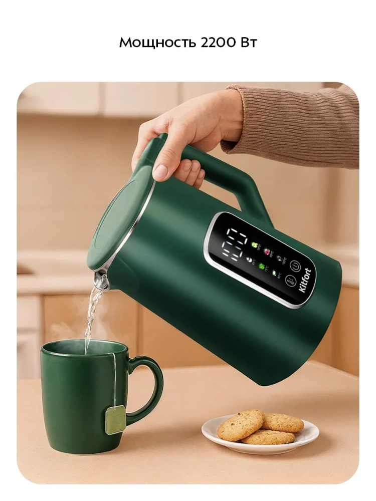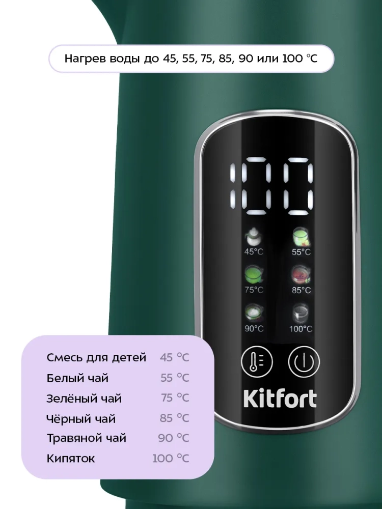 Электрический чайник Kitfort КТ-8726 предназначен для кипячения воды дома, в офисе, на даче. Прибор также может нагреть воду до температуры 45, 55, 75, 85 или 90 °С и поддерживать заданную температуру в течение 2 часов. Температура воды контролируется встроенным в дно чайника термодатчиком.
