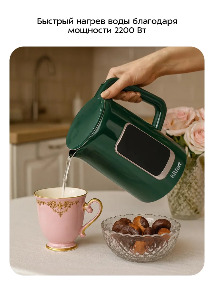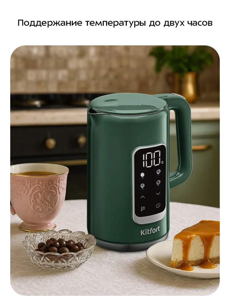 Электрический чайник Kitfort КТ-8758 предназначен для кипячения и нагревания воды дома, в офисе, на даче. Вы можете настроить температуру от 40 до 100 °С с шагом 5 °С, а также быстро установить температуру 40, 70, 80 или 90 °С с помощью кнопок температурных режимов. После нагрева прибор будет поддерживать заданную температуру в течение 2 часов. Температура воды контролируется встроенным в дно чайника термодатчиком.