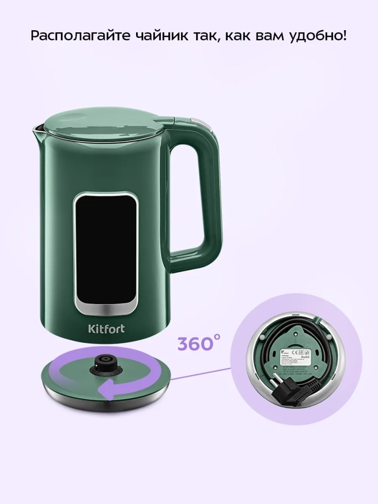 Подставка с центральным контактом дает возможность располагать на ней чайник в любом положении, обеспечивая вращение на 360°. Снизу имеется отсек для хранения шнура, в который можно смотать излишки шнура электропитания, чтобы он не мешал на столе.