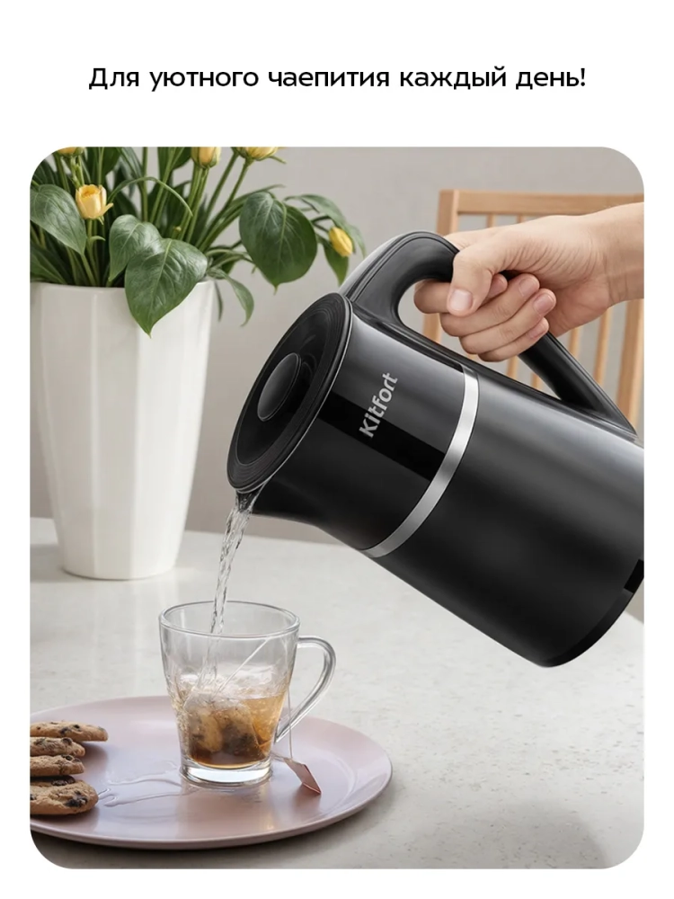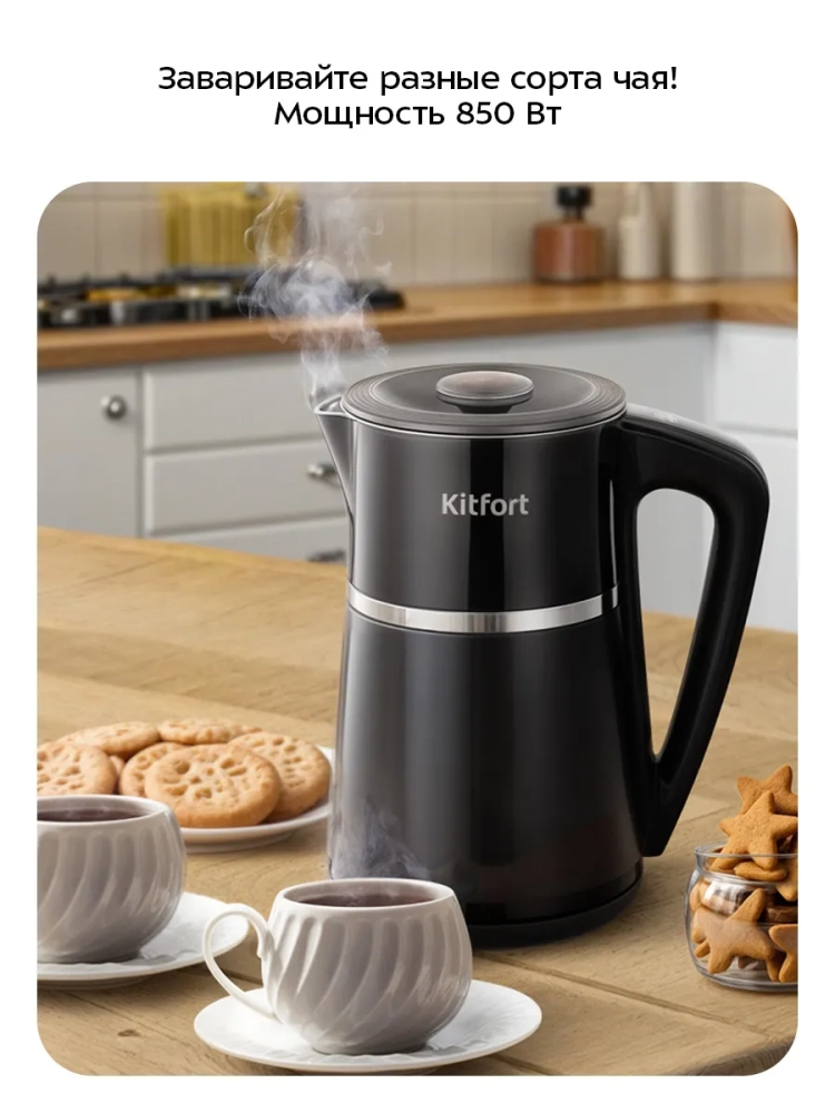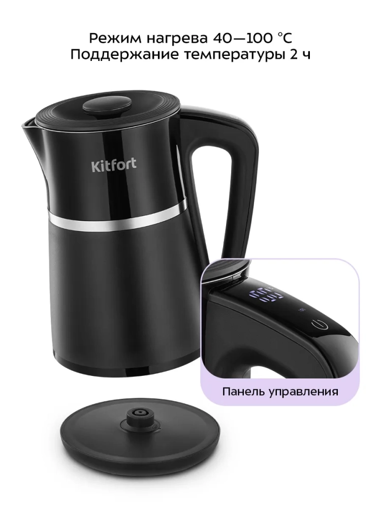 Электрический чайник Kitfort КТ-6698 может не только вскипятить воду, но и нагреть ее до температуры 40, 60, 80, 90 °С. Чайник также оснащен функцией поддержания температуры в течение 2 часов. Температура воды контролируется встроенным в дно чайника термодатчиком и отображается на дисплее в реальном времени.