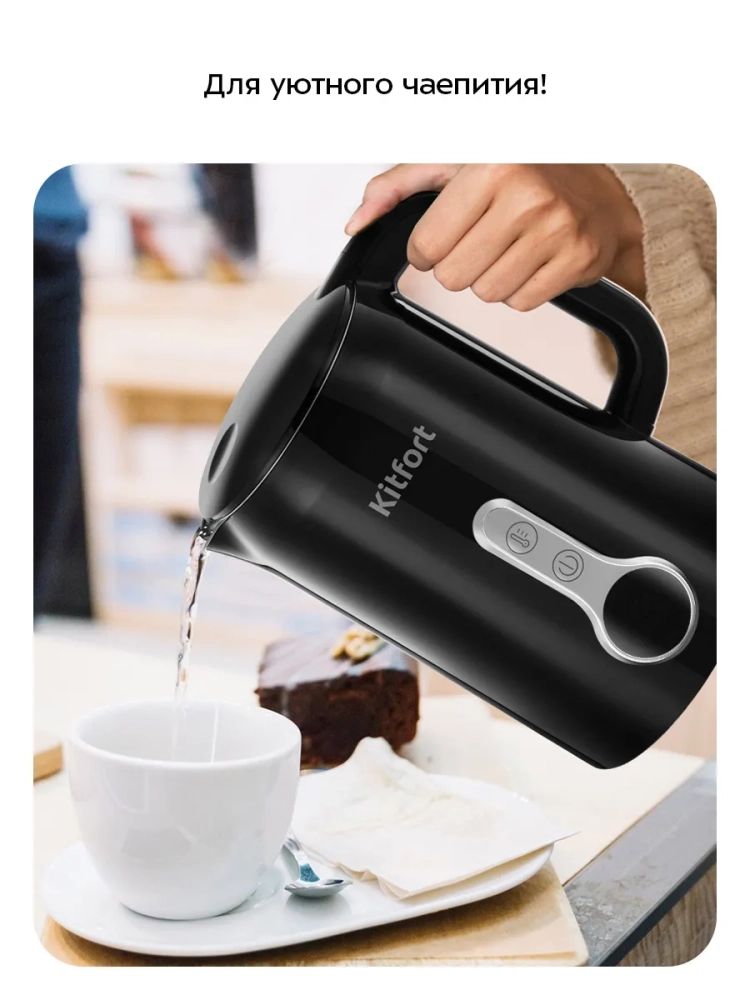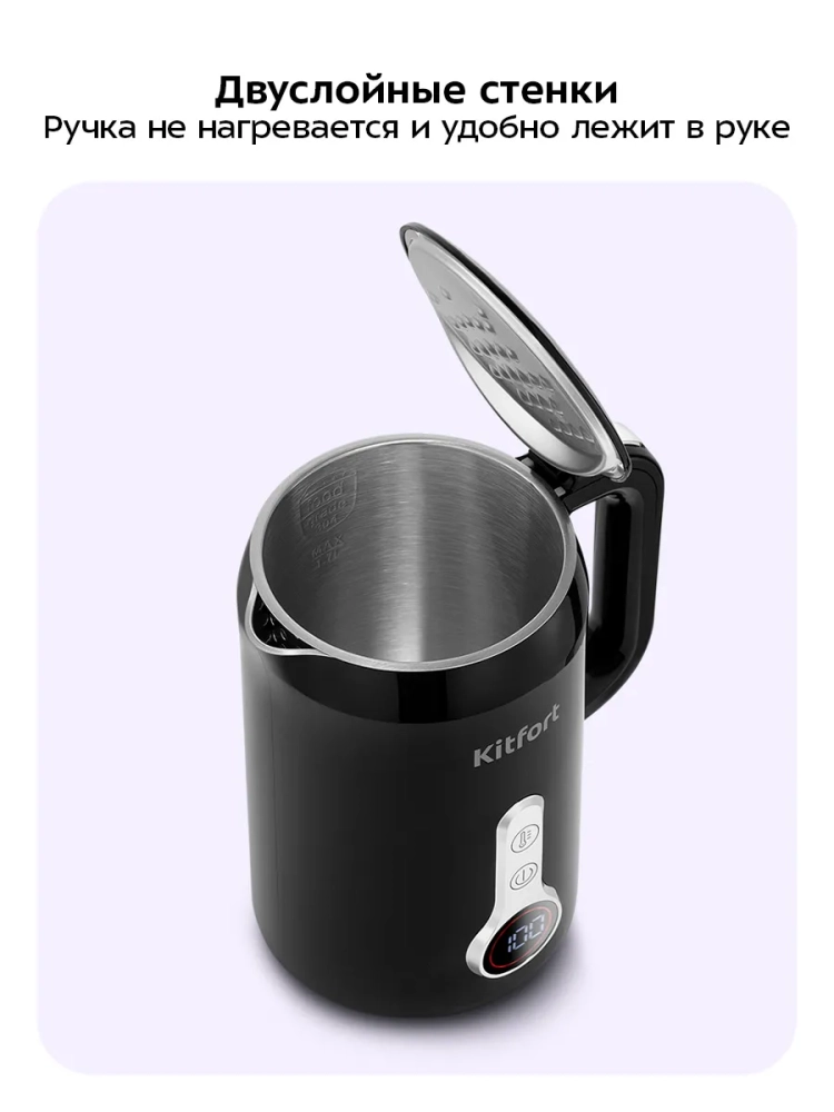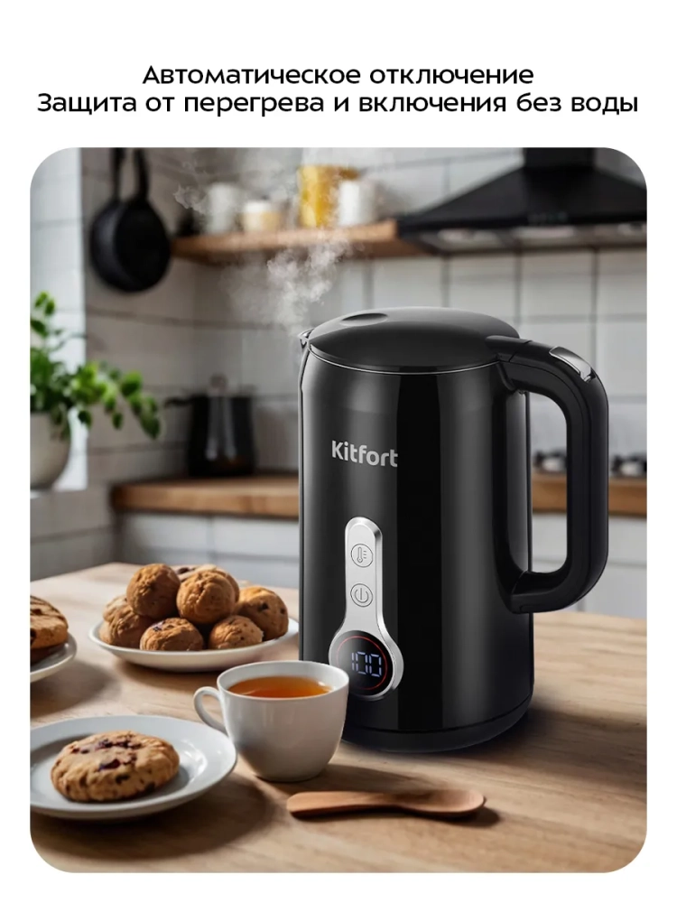 Электрический чайник с электронным терморегулятором Kitfort КТ-6701 может не только вскипятить воду, но и нагреть ее от 40 до 90 °С с шагом 10 °С, что очень удобно при заваривании различных сортов чая. Чайник также оснащен функцией поддержания температуры в течение 2 часов. Температура воды контролируется встроенным термодатчиком.