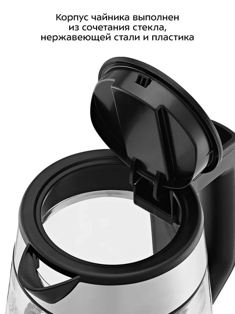 Мерная шкала находится на внешней стороне корпуса. Благодаря прозрачным стенкам удобно отслеживать уровень воды в чайнике.
