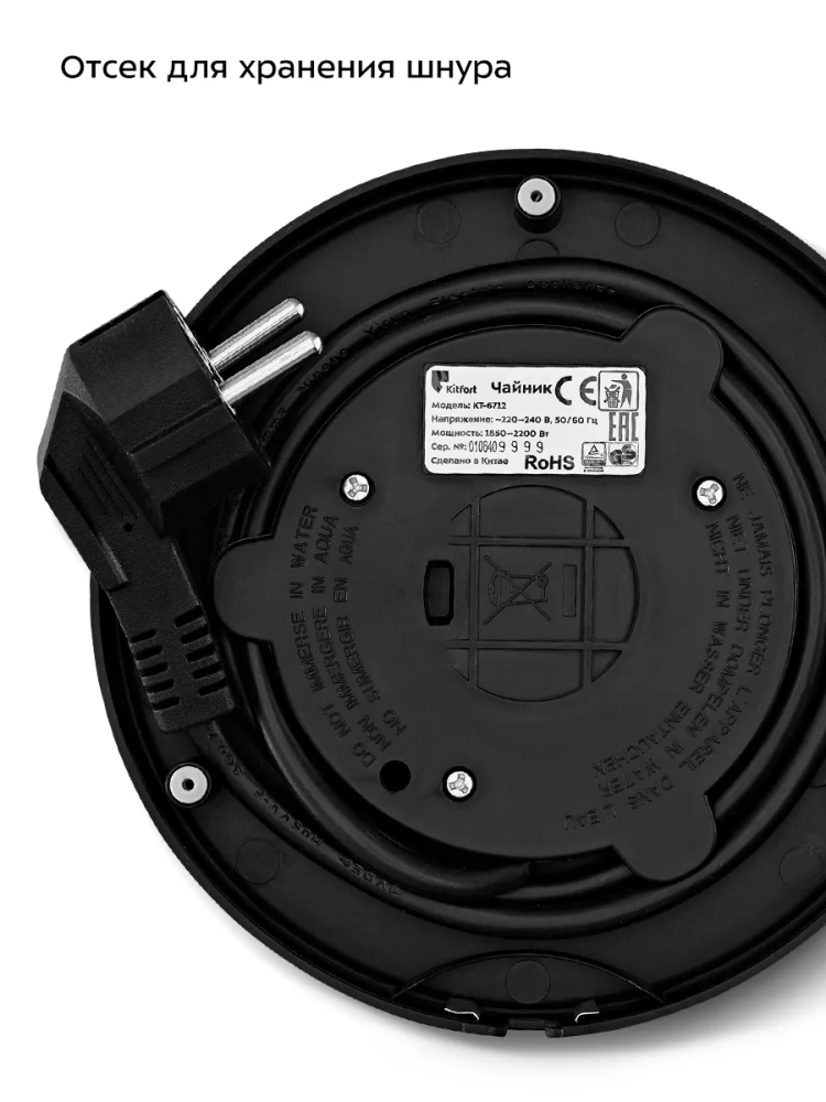 Подставка с центральным контактом дает возможность располагать на ней чайник в любом положении, обеспечивая вращение на 360°. Снизу подставки расположен отсек для хранения шнура, чтобы шнур не мешал на столе.