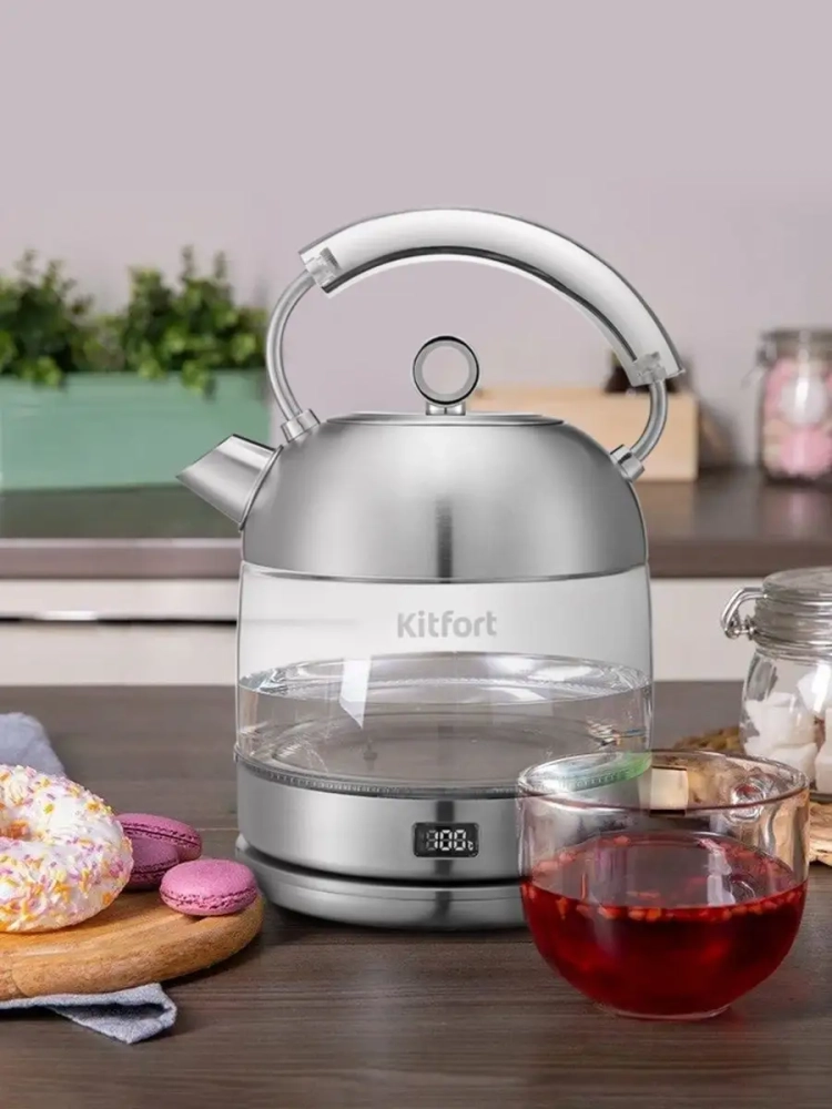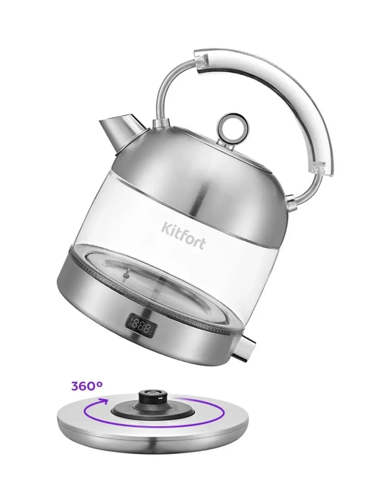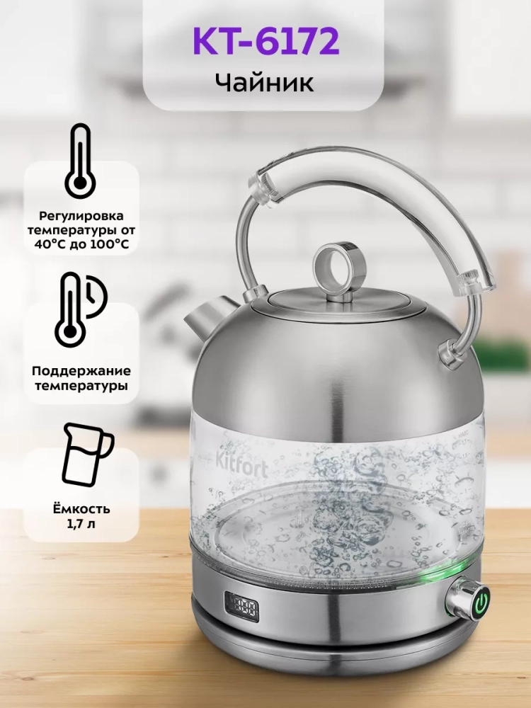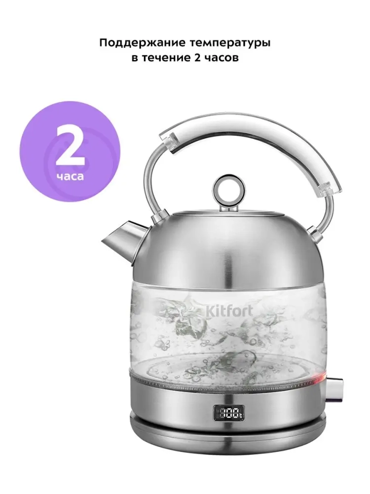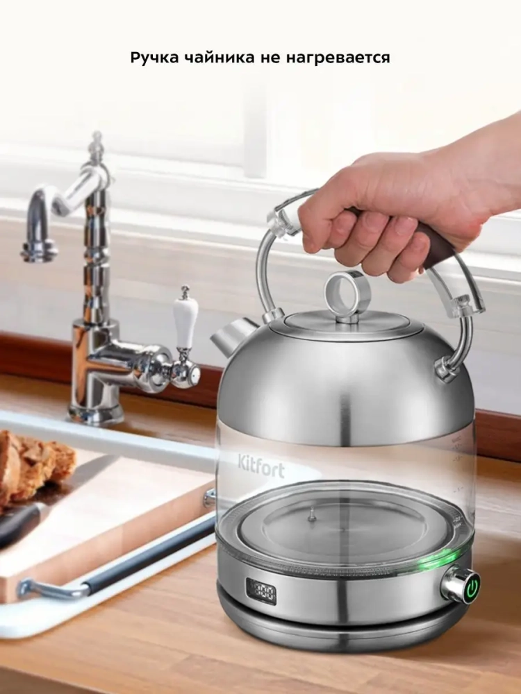 Электрический чайник с электронным терморегулятором Kitfort КТ-6172 может не только вскипятить воду, но и нагреть ее до температур: 40, 50, 60, 70, 80, 90 и 100 °С, что очень удобно при заваривании различных сортов чая. Температура 40 °С удобна для приготовления детского питания. Чайник также оснащен функцией поддержания температуры. Корпус чайника выполнен из стекла и нержавеющей стали, а крышка и подставка — из пластмассы и нержавеющей стали. Мерная шкала нанесена на прозрачную часть корпуса. Съемная крышка и большое горлышко чайника облегчают доступ внутрь при его мойке и во время удаления накипи. Ручка чайника пластиковая, не нагревается и удобно лежит в руке. На корпусе расположен регулятор температуры и LED-дисплей. На дисплее отображается температура воды в чайнике и значок поддержания температуры. Температура воды отображается на дисплее в течение 5 минут, что очень удобно. Нагревательный элемент (ТЭН) у этой модели чайника скрытый и находится в донной части. Подставка с центральным контактом дает возможность располагать на ней чайник в любом положении, обеспечивая вращение на 360°. Снизу имеется отсек для хранения шнура, в который можно смотать излишки шнура электропитания, чтобы он не мешал на столе. На регуляторе температуры расположена сенсорная кнопка включения и выключения чайника. Кнопка «Вкл/Выкл» со световой индикацией. После закипания или по достижении установленной температуры, при изменении температуры и включении нагрева, кипячения или режима поддержания температуры, а также при установке чайника на подставку раздается звуковой сигнал. Полный чайник закипает за 5–6 минут. При закипании чайник автоматически отключится. Прибор имеет защиту от перегрева и от включения без воды: при включении без воды чайник нагревается и отключается (срабатывает защита от перегрева).