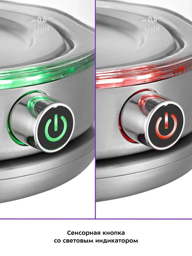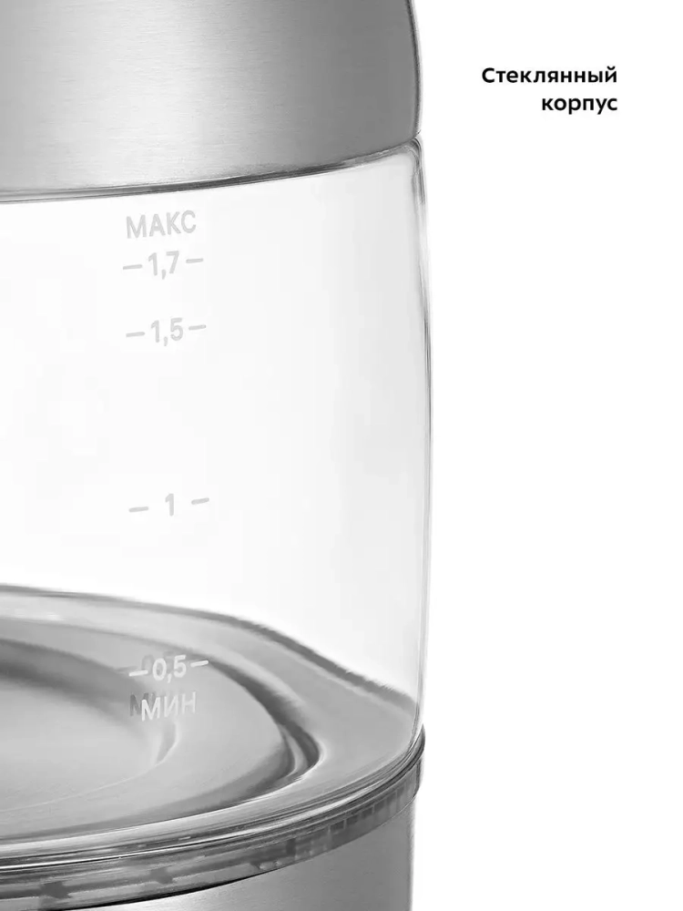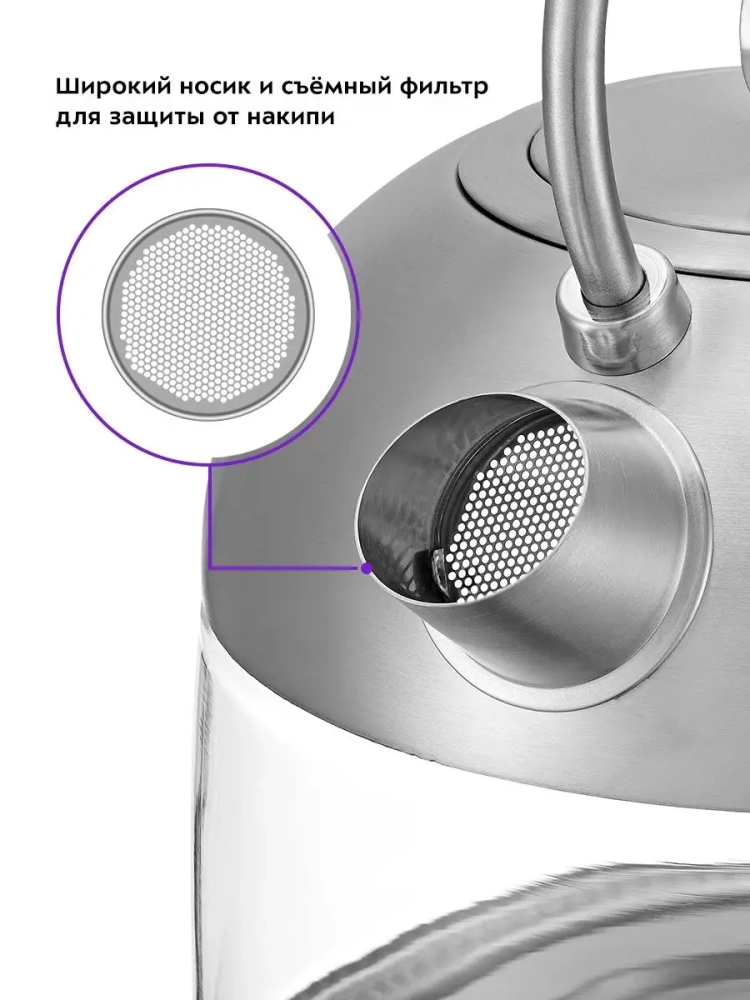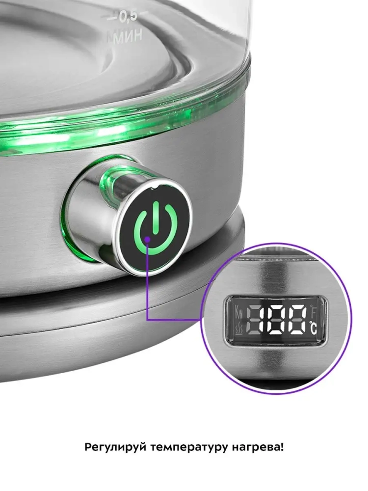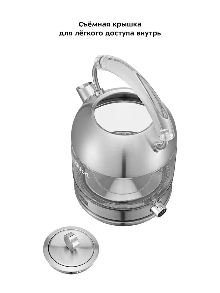 Электрический чайник с электронным терморегулятором Kitfort КТ-6172 может не только вскипятить воду, но и нагреть ее до температур: 40, 50, 60, 70, 80, 90 и 100 °С, что очень удобно при заваривании различных сортов чая. Температура 40 °С удобна для приготовления детского питания. Чайник также оснащен функцией поддержания температуры. Корпус чайника выполнен из стекла и нержавеющей стали, а крышка и подставка — из пластмассы и нержавеющей стали. Мерная шкала нанесена на прозрачную часть корпуса. Съемная крышка и большое горлышко чайника облегчают доступ внутрь при его мойке и во время удаления накипи. Ручка чайника пластиковая, не нагревается и удобно лежит в руке. На корпусе расположен регулятор температуры и LED-дисплей. На дисплее отображается температура воды в чайнике и значок поддержания температуры. Температура воды отображается на дисплее в течение 5 минут, что очень удобно. Нагревательный элемент (ТЭН) у этой модели чайника скрытый и находится в донной части. Подставка с центральным контактом дает возможность располагать на ней чайник в любом положении, обеспечивая вращение на 360°. Снизу имеется отсек для хранения шнура, в который можно смотать излишки шнура электропитания, чтобы он не мешал на столе. На регуляторе температуры расположена сенсорная кнопка включения и выключения чайника. Кнопка «Вкл/Выкл» со световой индикацией. После закипания или по достижении установленной температуры, при изменении температуры и включении нагрева, кипячения или режима поддержания температуры, а также при установке чайника на подставку раздается звуковой сигнал. Полный чайник закипает за 5–6 минут. При закипании чайник автоматически отключится. Прибор имеет защиту от перегрева и от включения без воды: при включении без воды чайник нагревается и отключается (срабатывает защита от перегрева).
