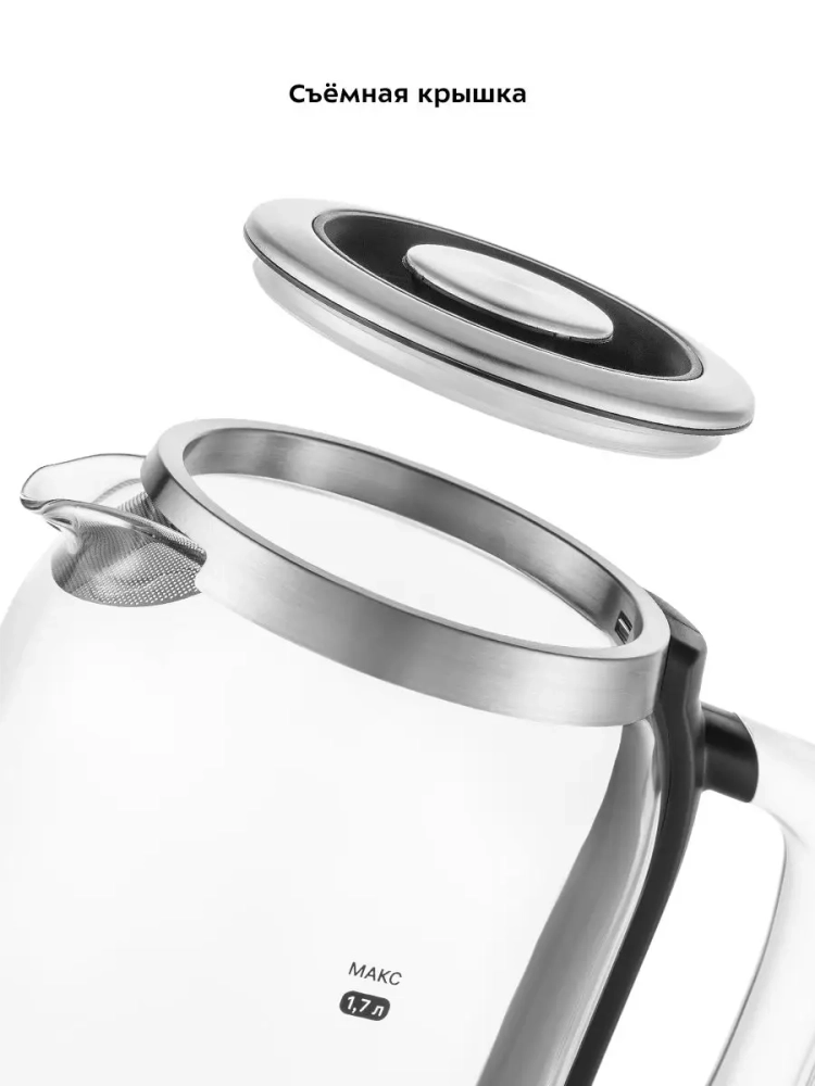 Колба чайника стеклянная. Ручка выполнена из пластика, а крышка и подставка выполнены из сочетания нержавеющей стали и пластика. Мерная шкала находится на лицевой стороне стеклянной части корпуса. Конструкция чайника не позволяет ручке нагреваться, поэтому браться за нее абсолютно безопасно.