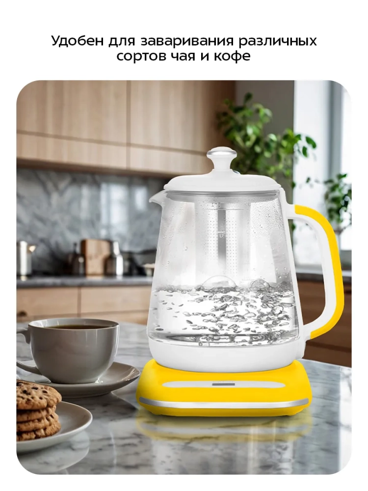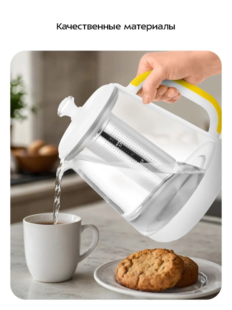 Корпус чайника выполнен из стекла и пластика. Мерная шкала нанесена на стеклянную часть корпуса. Пластиковая ручка чайника позволяет удобно держать его в руке: ручка не скользит и не нагревается благодаря особенностям конструкции. Чайник также оснащен фильтром из нержавеющей стали для чая или кофе. Подставка с центральным контактом дает возможность располагать на ней чайник в любом положении, обеспечивая вращение на 360°.