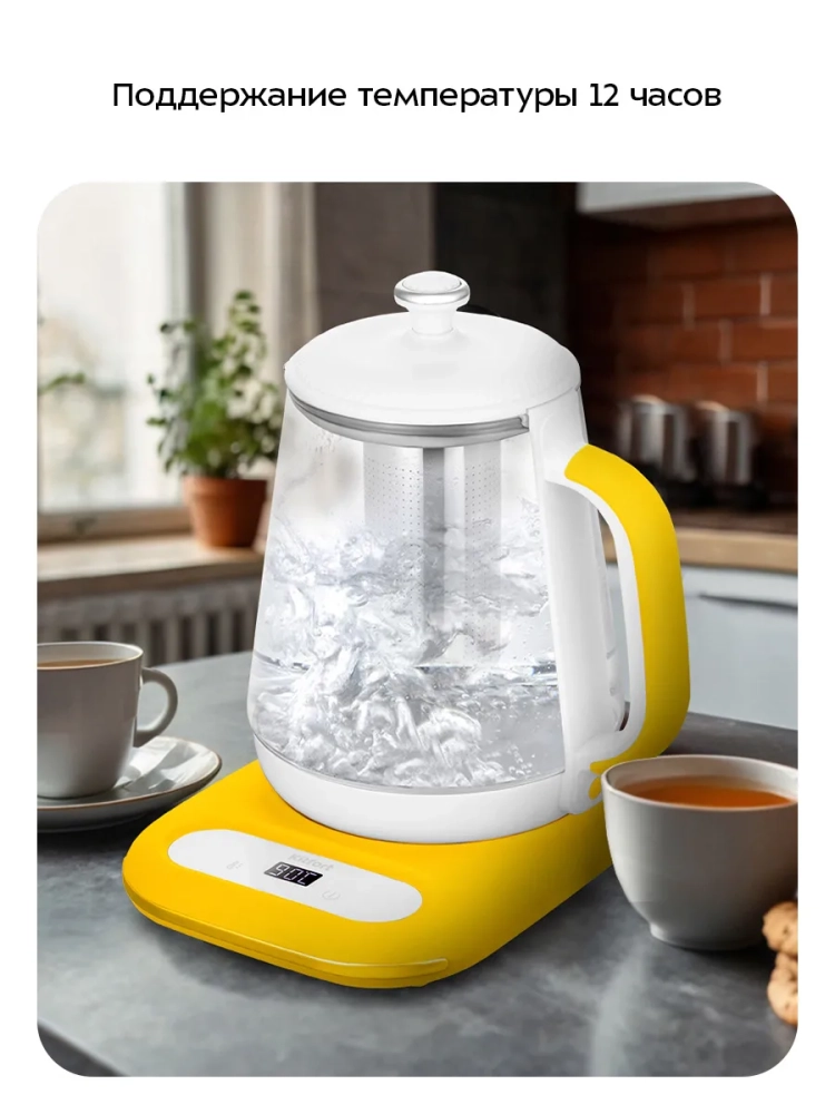 Панель управления с дисплеем находится на подставке чайника. На дисплее отображается текущая температура воды в чайнике, а при установке температуры — температура нагрева воды. При поддержании температуры также отображается оставшееся время работы.