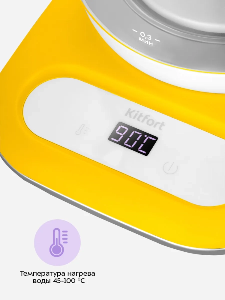 Электрический чайник Kitfort КТ-6755 может не только вскипятить воду, но и нагреть ее до температуры 45, 60, 70, 80 или 90 °С, что очень удобно при заваривании различных сортов чая и кофе, а также при приготовлении детского питания. Чайник также оснащен функцией поддержания температуры в течение 12 часов. Температура воды контролируется встроенным в дно чайника термодатчиком.
