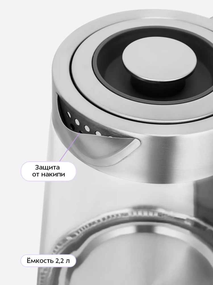 Полный чайник закипает примерно за 6 минут. Чайник автоматически отключается при закипании, имеет защиту от перегрева и от включения без воды.