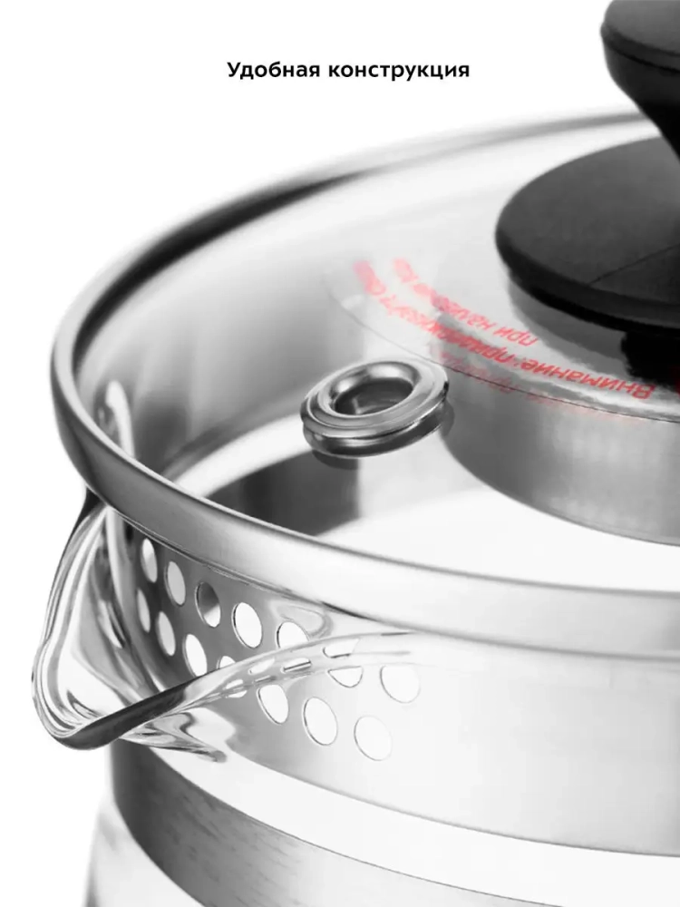 Скрытый нагревательный элемент из нержавеющей стали предотвращает образование накипи и снижает уровень шума при работе. Чайник автоматически отключается при закипании и имеет защиту от перегрева и включения без воды, что делает его безопасным для использования в доме.